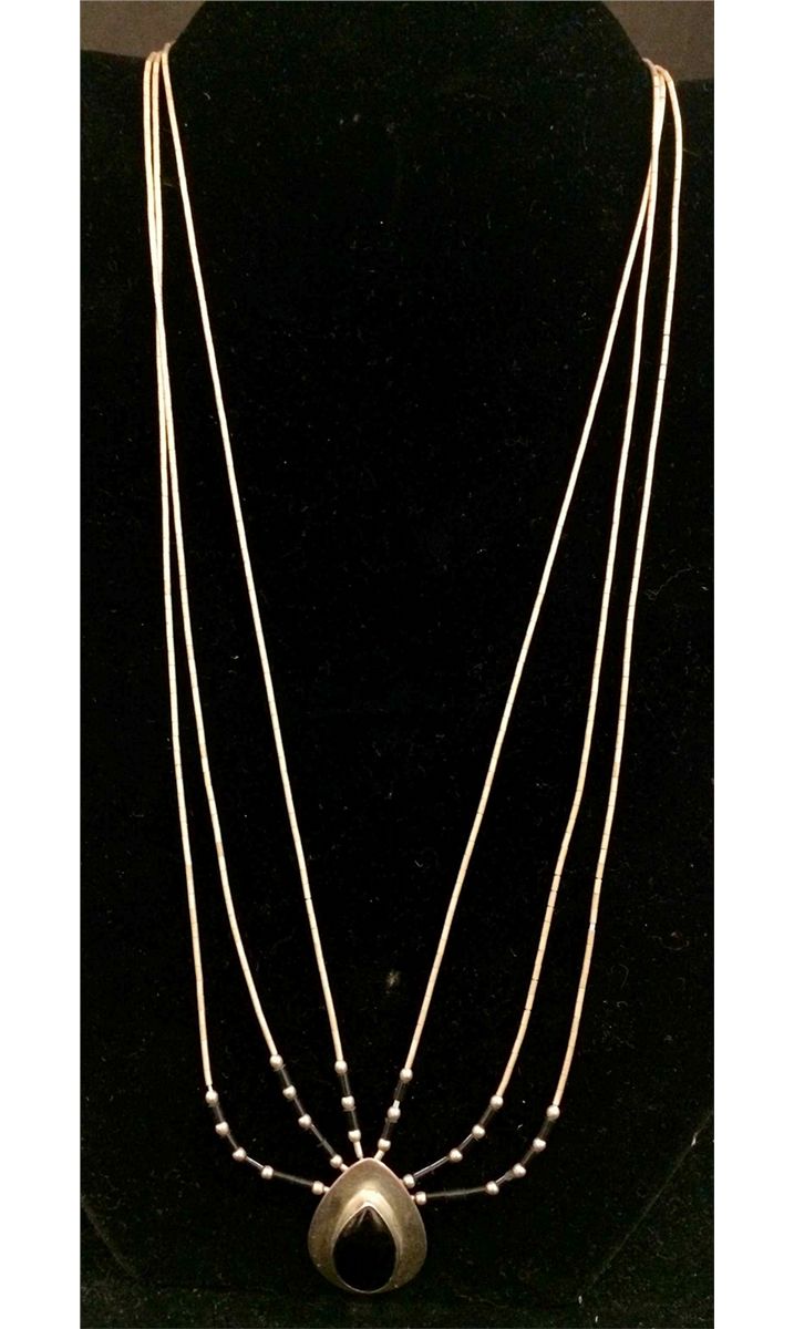This necklace contains three strands of liquid silver each with Onyx Accent beads, topped off with a Sterling silver and Onyx pendant.