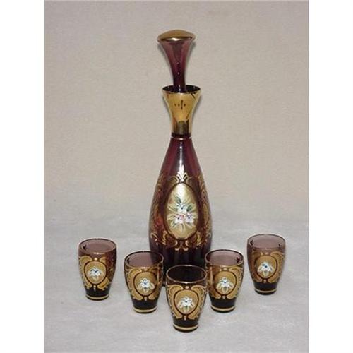 A six piece liquor set including: 11 3/4" tall decanter, 5- 2 1/2" tall glasses, amethyst with gold decoration, all in perfect condition. Probably made in the 1950's in Czechoslovakia. (2)