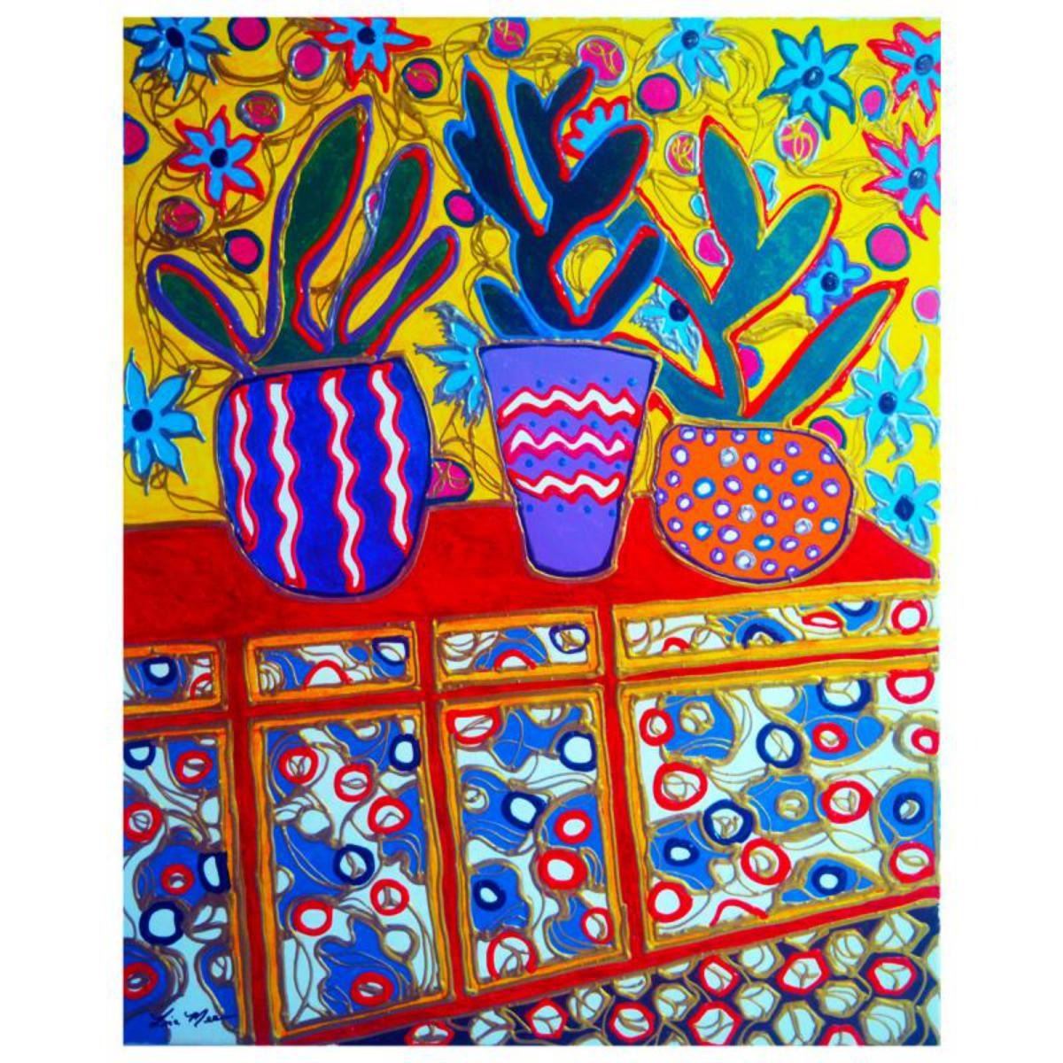 "Three Cactus Plants" is an original mixed media painting on canvas by Lisa Mee. Incorporating acrylic and metallic paint, this piece is hand signed and comes with a letter of authenticity. Measures approximately 30" x 24". Reference #: 251265