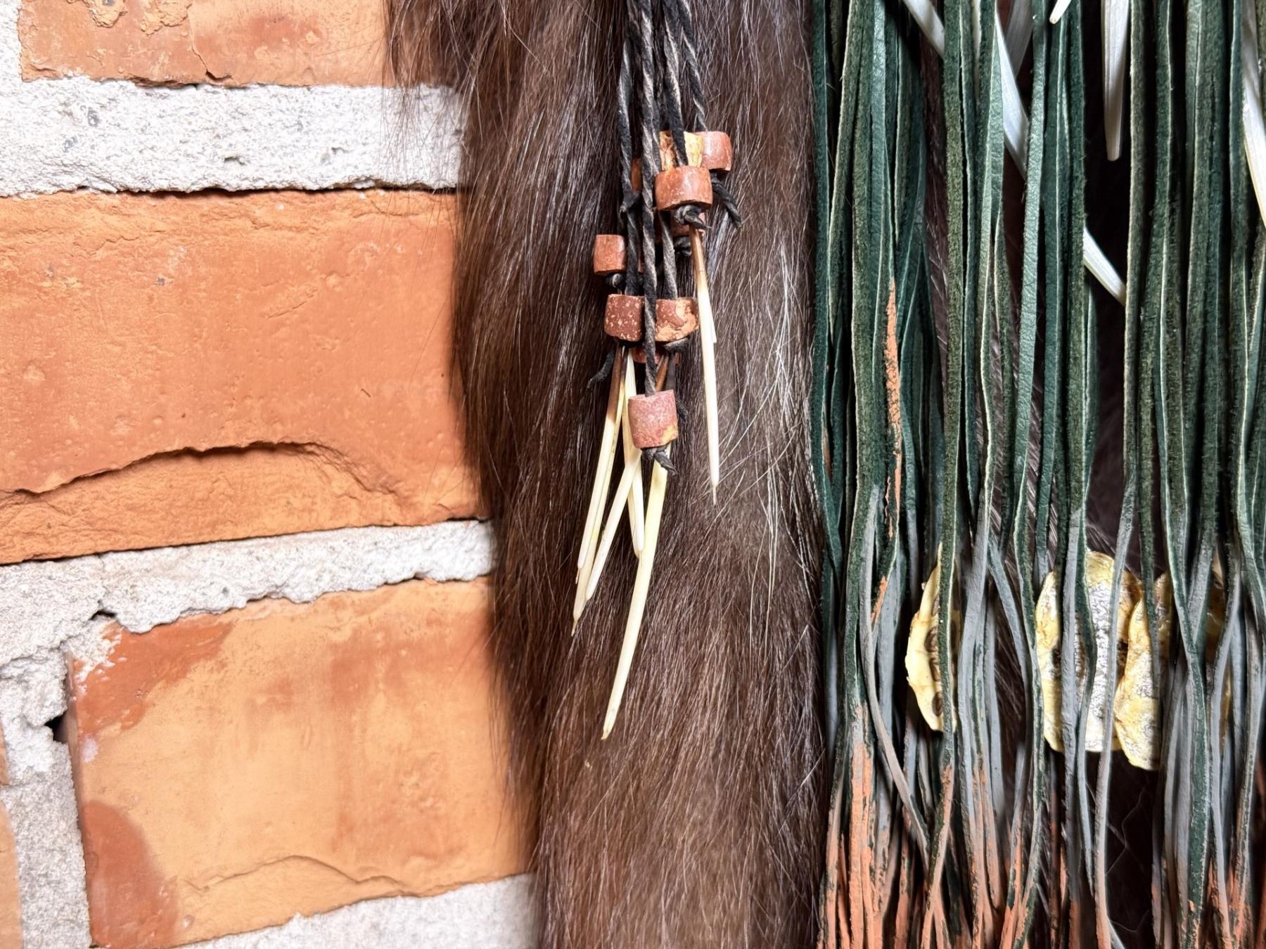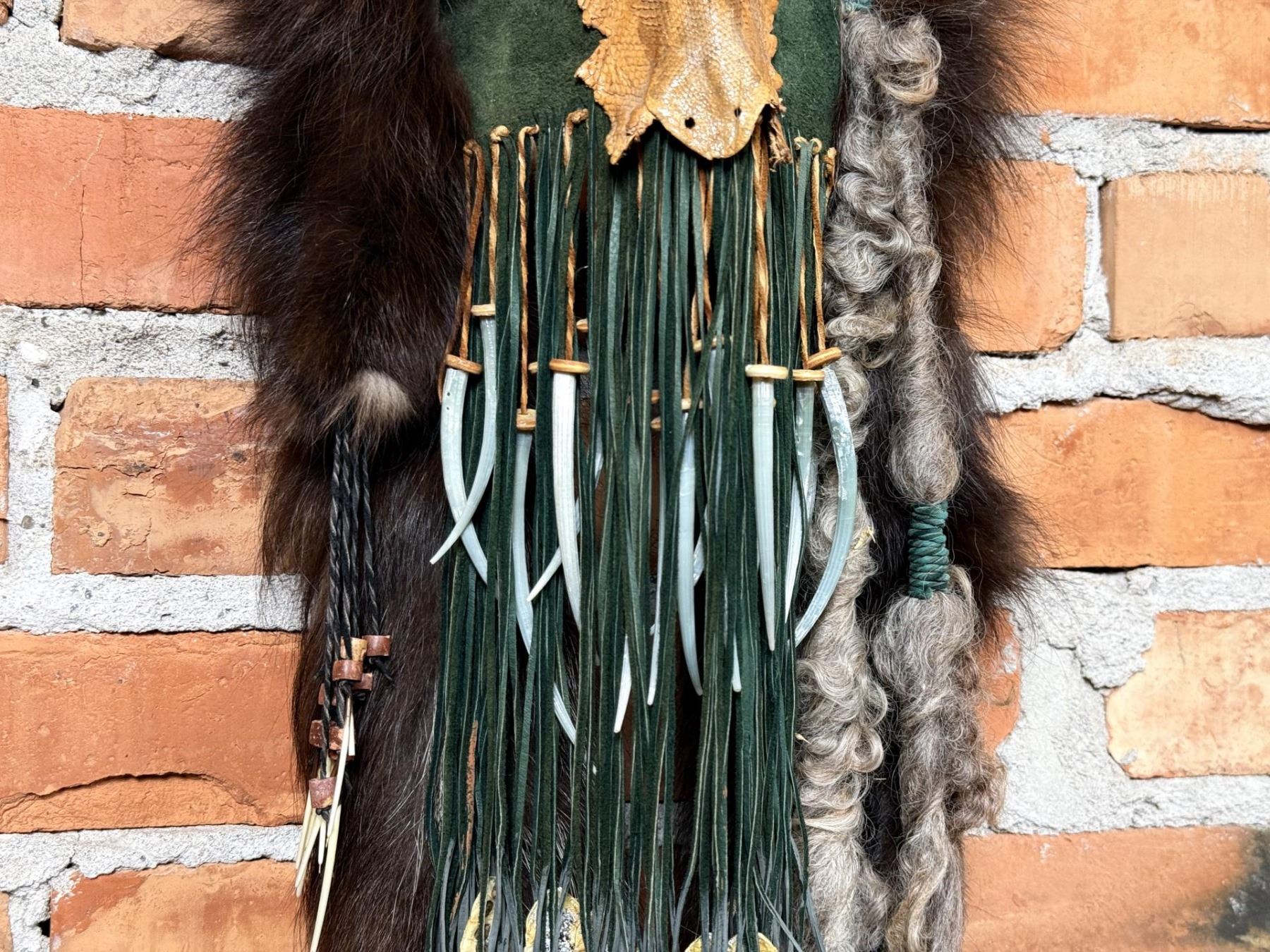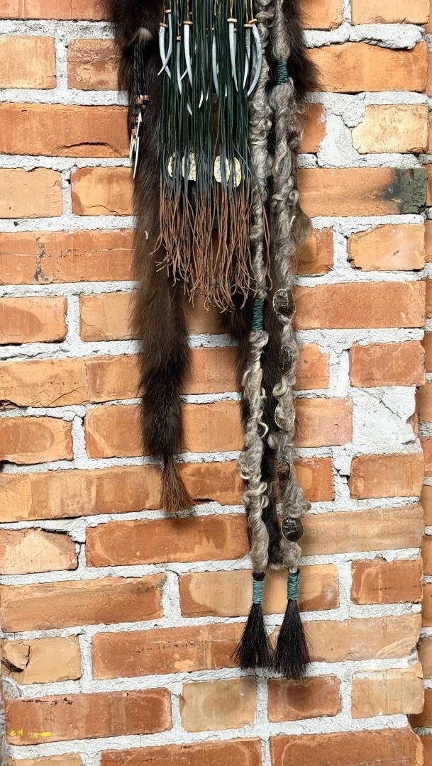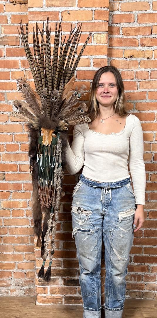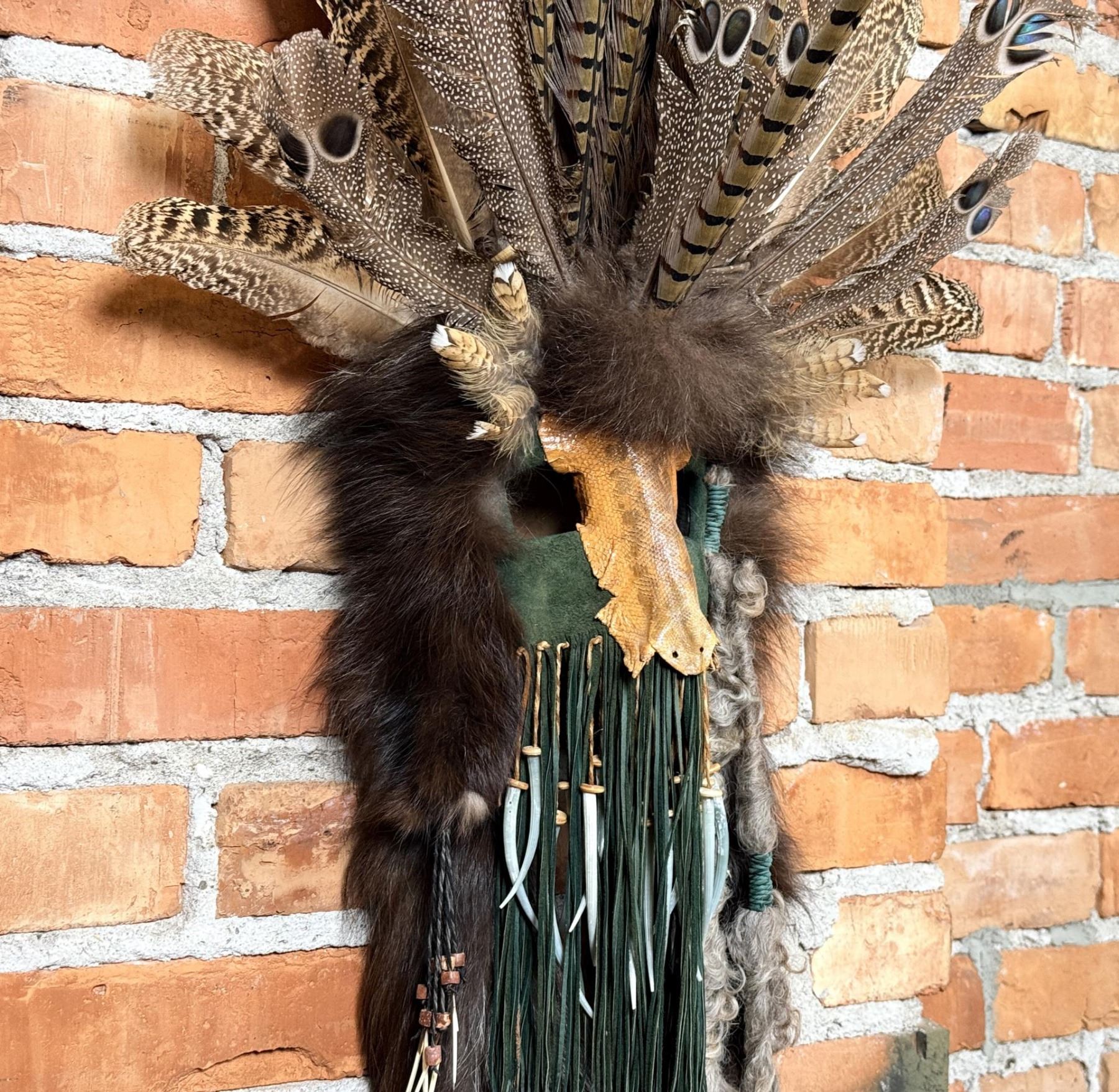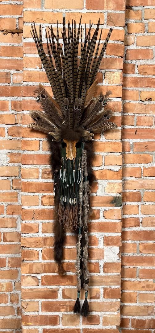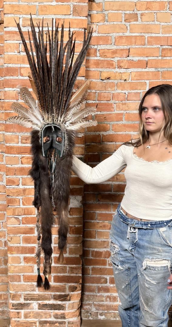 59" long. Lisa Ray (20/21st century) is active/lives in Washington. Lisa Ray is known for Mix media mask. A resident of Spokane, Washington, Lisa Ray is an artist who creates masks using materials including feathers, fur, rawhide, beads and other objects to depict items from her native Algonquin Shawnee heritage. She specializes in quill and beadwork as well as the preparation of furs, skulls and skins. In her work, Lisa Ray reflects her own Native American Heritage and has also studied the traditions of other North American Tribes over the past 15 years. She utilizes symbolic elements from these various cultures in a contemporary style and through artistic mediums to convey Native American tradition and history. Historically, masks were incorporated into the ceremonies, traditions, and spirituality of many tribes from around the world. Masks were considered to be alive, representing beings that exist in the spirit world. Individuals of importance, in order to communicate with ancestors, connect with and personify spirits, and to transform ones identity, wore masks. Families and clans within a tribe often used masks as genealogical record keepers. Significant events such as a birth, death, victory in battle, or a successful hunt were recorded on these masks. Thus, each item contained on the masks is symbolic, having particular meaning to the tribes. Masks are considered sacred and were made according to strict tribal traditions.