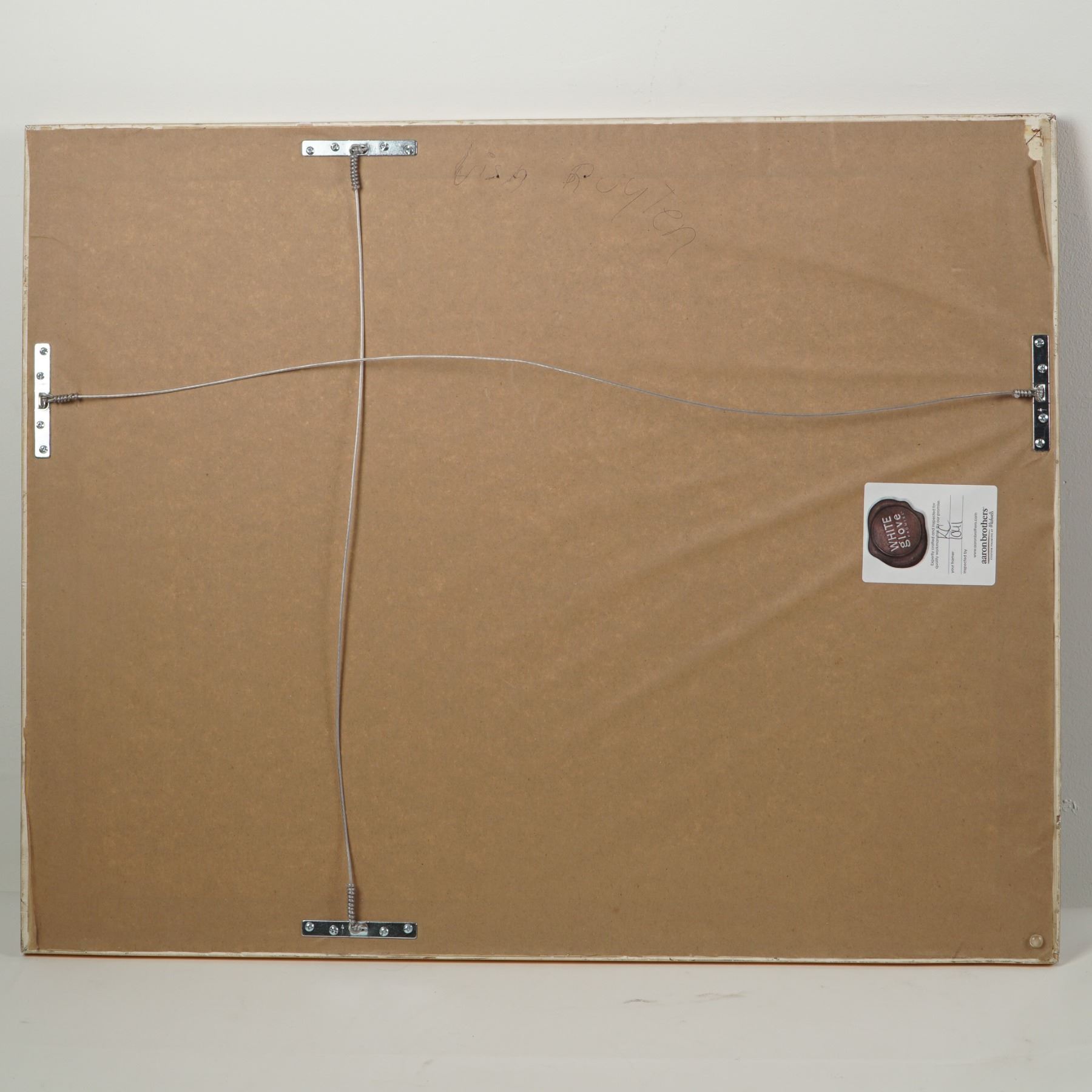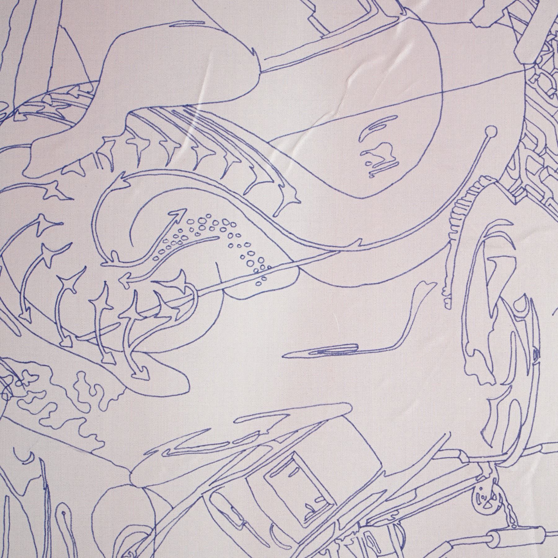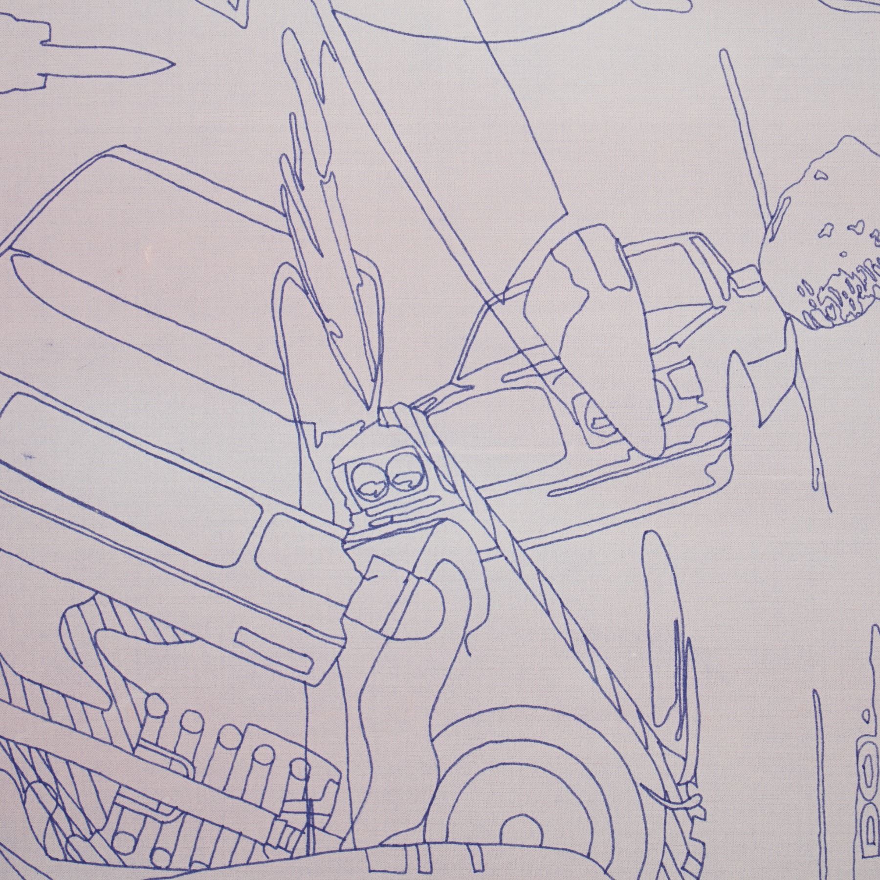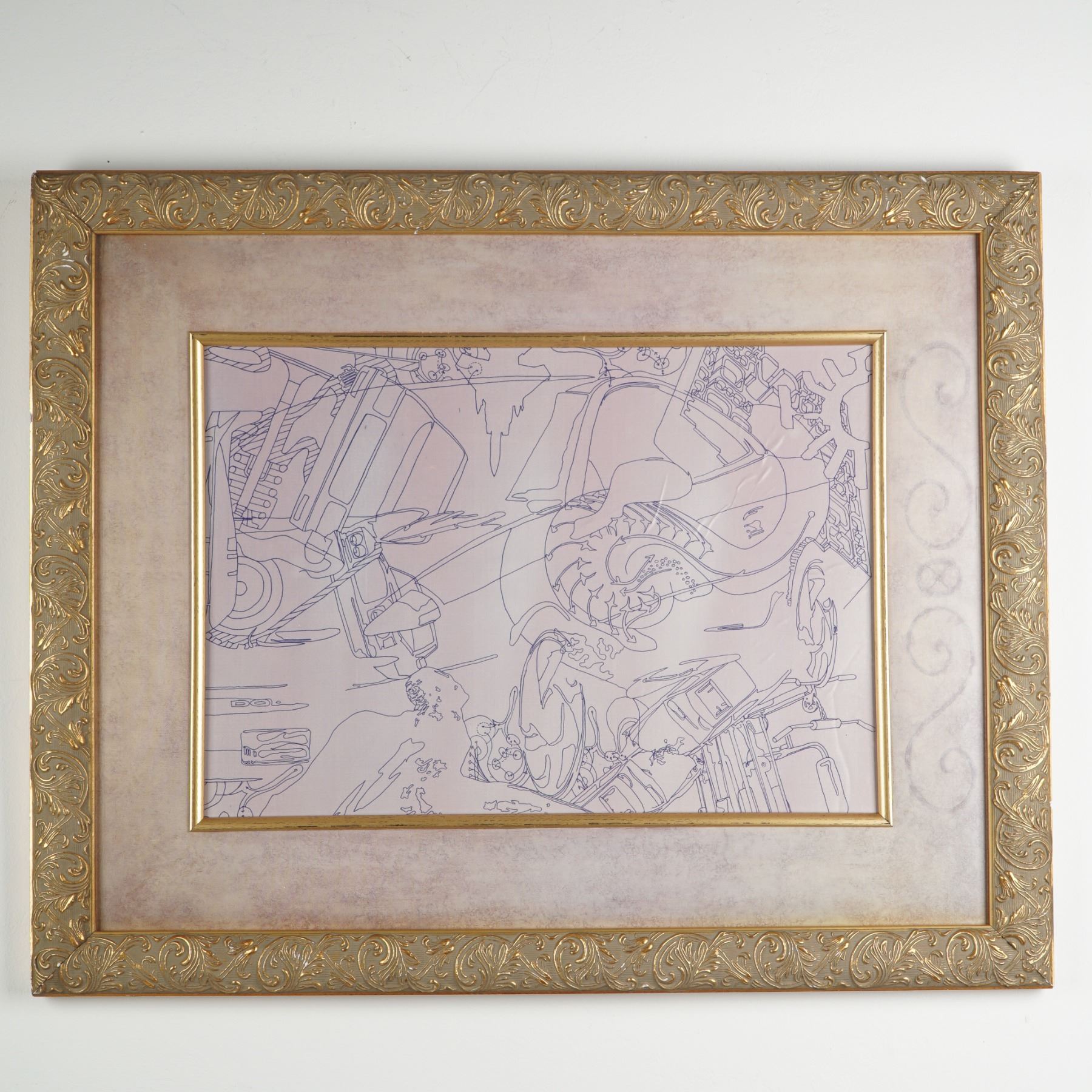 This intriguing work is a preparatory printed drawing attributed to contemporary American artist Lisa Ruyter. The composition features a dense, dynamic network of overlapping automotive and mechanical elements rendered in purple linework across a pale ground, consistent with Ruyter's practice of translating photographs into flattened, graphic abstractions. The design is printed on plastic canvas fiber and applied to board, serving as a preliminary step in the artist's signature process of creating brightly colored enamel or acrylic paintings. Lisa Ruyter is a prominent figure in contemporary art, known for her bold, pop-inspired figurative and architectural works. Born in Washington, D.C., and based in Vienna, Austria, Ruyter uses photographic imagery as the basis for her paintings, reducing complex scenes into areas of flat color bordered by contour lines. Her work critiques and reflects on consumerism, memory, and perception, with exhibitions in major institutions including MoMA PS1, the Whitney Museum of American Art, and the Museum der Moderne Salzburg. Framed in a gilt border with decorative scrollwork, the piece reflects the foundational stages of Ruyter's creative exploration of contemporary culture and visual overload.
