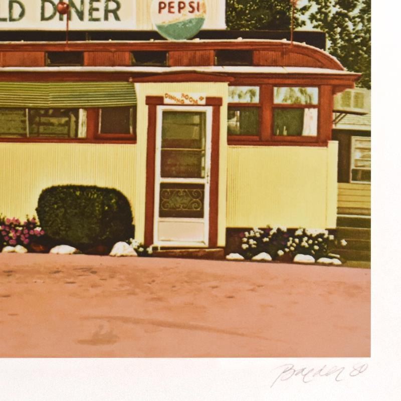 "Lisi's Pittsfield Diner" is a limited edition silkscreen on somerset paper by John Baeder, numbered and hand signed by the artist. Includes Letter of Authenticity. Measures approx. 30" x 22" (border); 25.5" x 16" (image). Due to the age of this piece there may be very minor wear on the corners that may be concealed when the piece is framed.