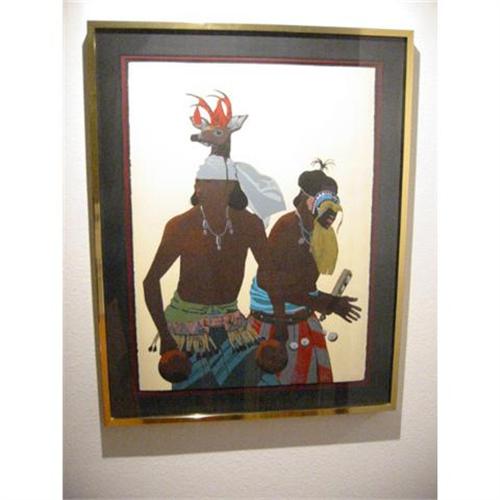 hand signed numbered and titled in pencil by "Louis De Mayo" Arizona artist. limited edidtion 96 from 100 in 1982. titled "Yaqui Deer Dancer" serigraph created by tolos graphic in feb, 1984 , with certificate of authenticy hand signed by editor Louis De Mayo Born in Philadelphia PA January 24,1926 and moved to Arizona in 1971 and is active in AZ . he was appointed Director of Arizona Highways Magazine. he is known for Modern Western Figure. this painting is magnificent with golden Aluminium frame and black mat. which is wonderful and decorative. in excellent condition and measures along with frame 37" T. X 29 " W. X 1.5 " D.