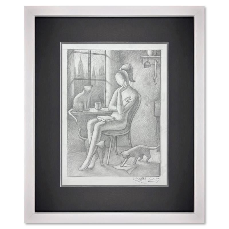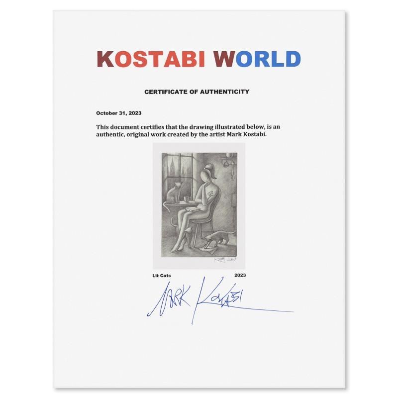"Lit Cats" is an original drawing on paper by Mark Kostabi, hand signed by the artist. This piece comes custom framed and includes a certificate of authenticity. Measures approximately 19" x 14.5" (frame), 13" x 8.5" (image).