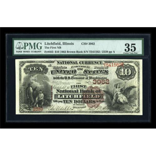 <B>Litchfield, IL</B></I> - $10 1882 Brown Back Fr. 483 <B>The First NB</B></I> Ch. # 3962<BR> A lovely high grade circulated pen signed specimen which we would have easily graded Extremely Fine. PMG has, in its usual conservative fashion, assigned the highest Very Fine grade of <B>Choice Very Fine 35,</B></I> but bidders should keep in mind that this is a note which appears New until examined very carefully. <BR><I>From The Thomas M. Flynn Collection</B></I><BR><BR><b>Shipping:</b> Coins & Currency (<a target="_blank" href="http://www.heritageauctions.com/common/shipping.php">view shipping information</a>)