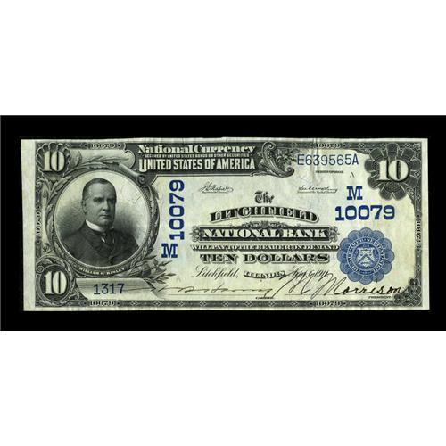 <B>Litchfield, IL</B></I> - $10 1902 Date Back Fr. 620 <B>The Litchfield NB</B></I> Ch. # (M)10079<BR>Three vertical folds and a lone horizontal fold prohibits a full EF grade on this attractive note. The signatures remain bold as does the seal, serial numbers, and charter numbers. <B>Very Fine-Extremely Fine.</B></I><BR><I>From The Lincoln Collection</B></I><BR><BR><b>Shipping:</b> Coins & Currency (<a target="_blank" href="http://www.heritageauctions.com/common/shipping.php">view shipping information</a>)