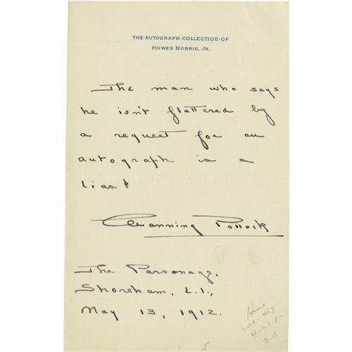 <B>Literary Autograph Collection "O-P".</B></I> An outstanding group of at least 85 different autographed items from various authors, poets, and educators. Included are: Channing Pollock (ANS); Theodore E. Perkins (AMuQS); Phoebe Palmer (AMsS "<I>The Shepherdess</B></I>"); Baroness Orczy (TLS); J. B. Priestley (TLS); John Poole (ANS); Dr. Mario A Pei (TLS); Henry Fairfield Osborn (AQS); Benjamin Park (ALS to Horace Greeley); Dawn Powell (Signature). This lot contains a wide range of material and the items are generally in fine condition. From the Henry E. Luhrs Collection. Accompanied by LOA from PSA/DNA.