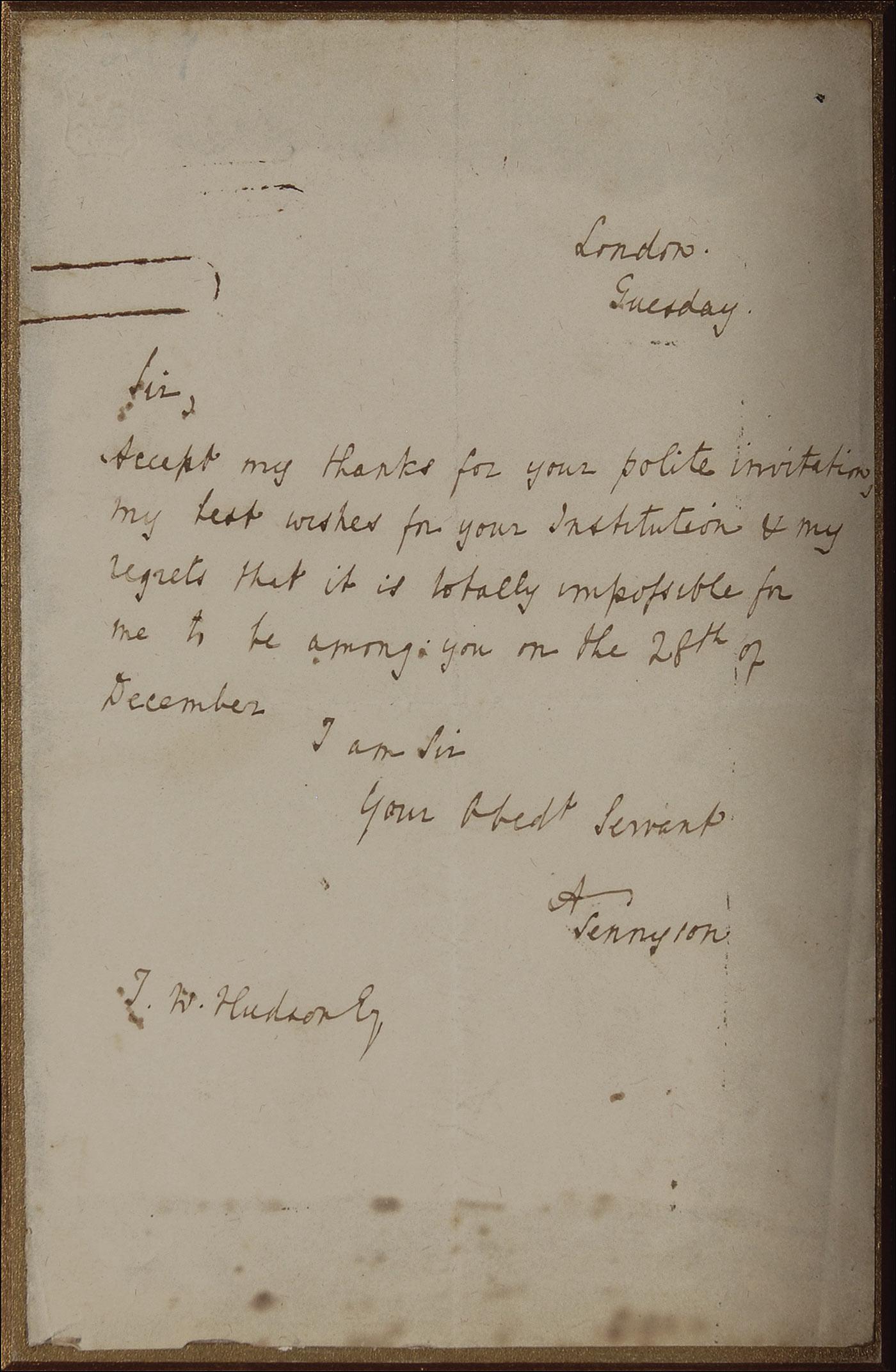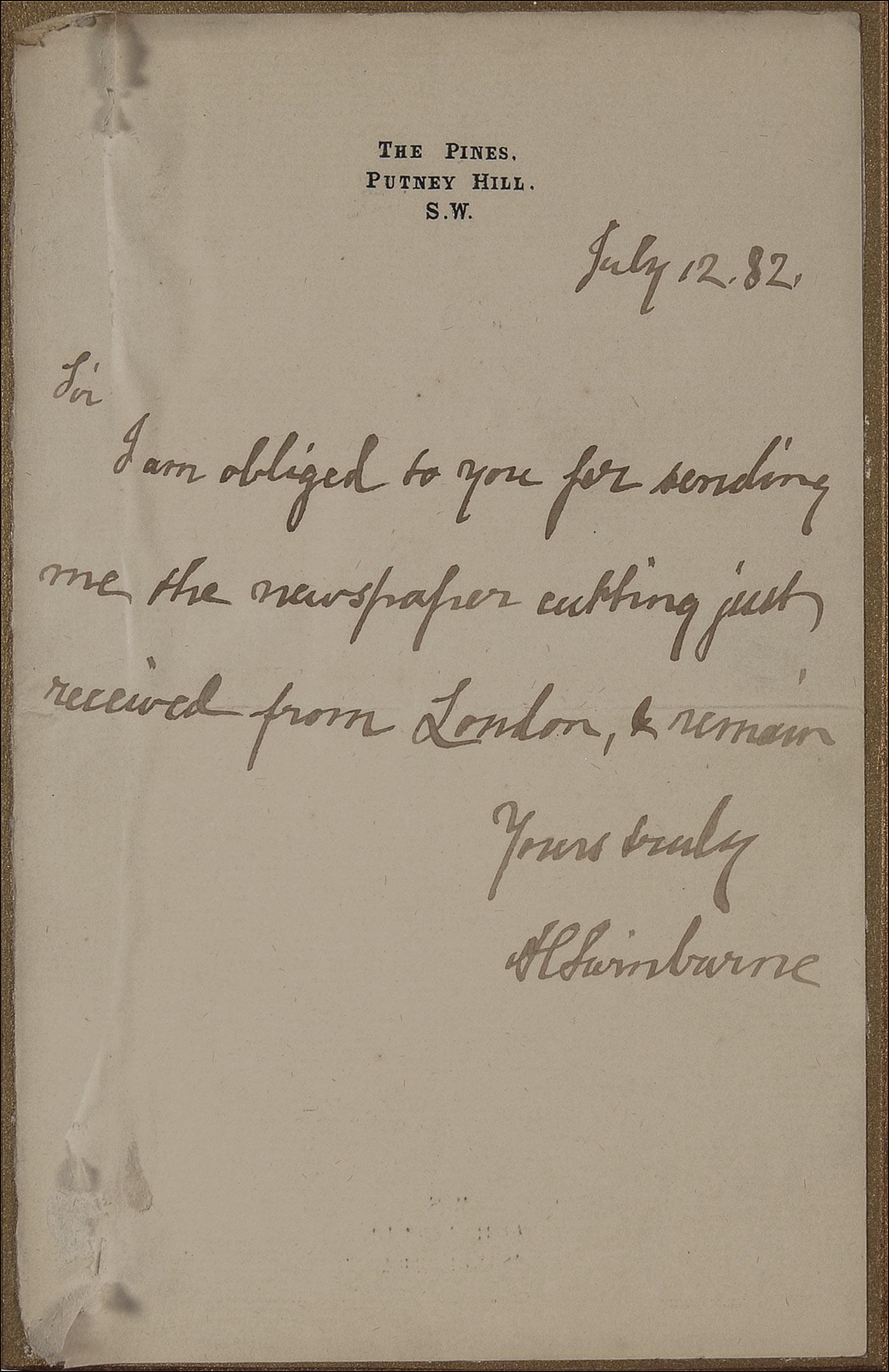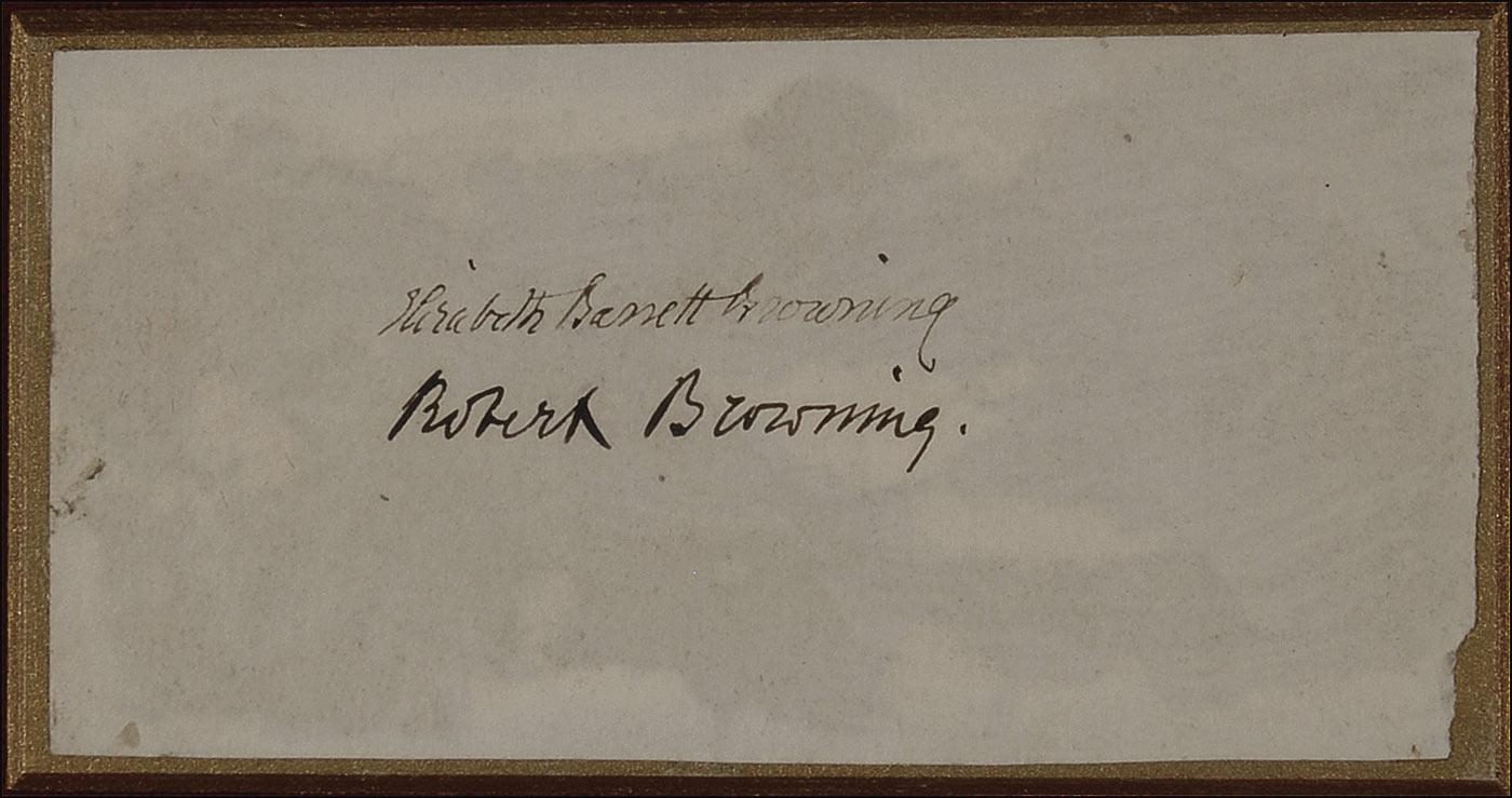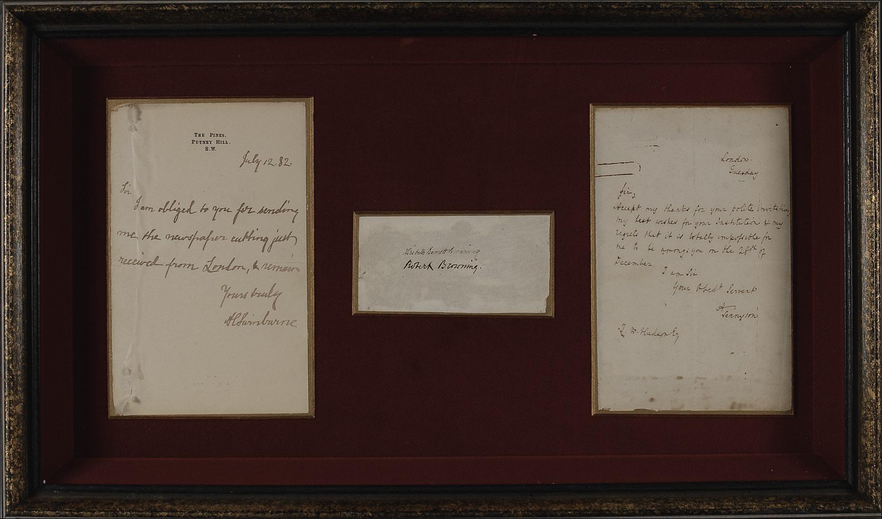 Astounding lot includes: the very rarely found together signatures of Elizabeth Barrett Browning and Robert Browning on a single 4 x 2.25 sheet; an ALS, 4.5 x 7.5, no date, signed “A. Tennyson,” which reads, in part: “My best wishes for your institution and my regrets that it is totally impossible for me to be among you on 28 December”; an ALS, 4.5 x 7.5, July 12, 1882, personal. letterhead, signed “A. Swinburne,” which reads, in part: “I am obliged to you for sending me the newspaper…” Each piece is affixed a slightly larger beveled gilt mount and the three are attractively shadow-box and framed to an overall size of 20 x 12. In overall very good to fine condition, with rough edges to all, a couple of areas of paper loss to left corners of the Swinburne letter and a rusted paper clip impression to the Tennyson.