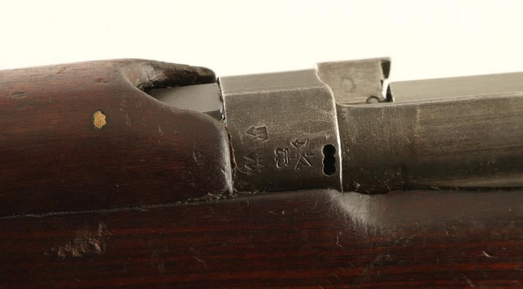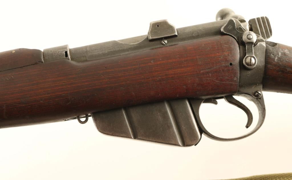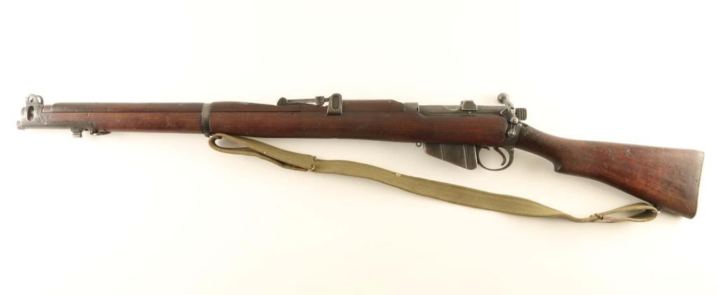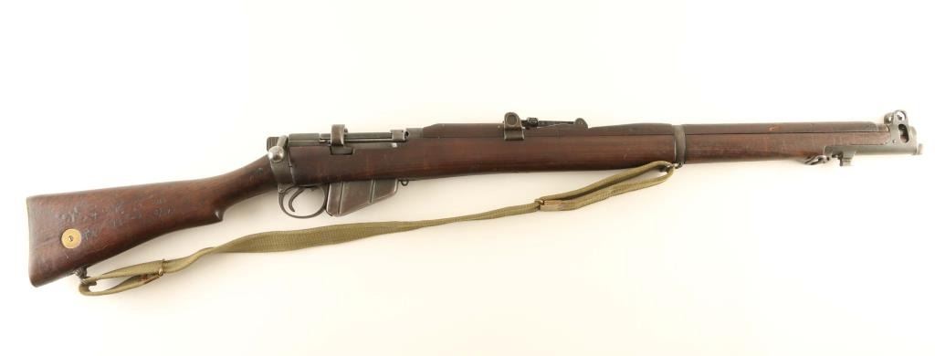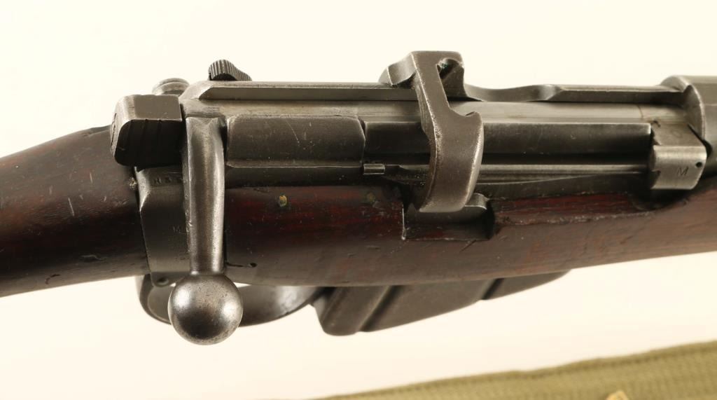 WWII era Australian military magazine fed bolt action service rifle chambered in .303 British, manufactured circa 1941. Features a parkerized finish, 25.2" barrel, raised patridge front sight, shrouded leaf type rear sight graduated to 2,000 yards, metal nosecap with bayonet lug & protective front sight ears, single barrel band, serrated trigger, detachable 10 round magazine, manual safety on the left side of the receiver, green canvas sling, charge loading bridge on the receiver, smooth full-length wood hand guard & forend and straight grip shoulder stock with inlayed brass disk on the right side & brass trapdoor buttplate. Matching serial numbers are found on the receiver and bolt handle with no numbers observed elsewhere. The right side of the butt socket is marked "M A/LITHGOW/S.M.L.E./III*/1941" and the stock is marked “R/MA/4/47” & “AUSTRALIA”. Rifle retains approximately 40% of its arsenal finish showing scattered wear and thinning with a brown patina comprising the balance. Action is smooth, the bore shows good luster & rifling with scattered pitting and the wood stocks are near good with scattered blemishes and a ¼” crack in the forend forward of the butt socket on the right side. Condition is NRA Good. ***C&R Firearm***