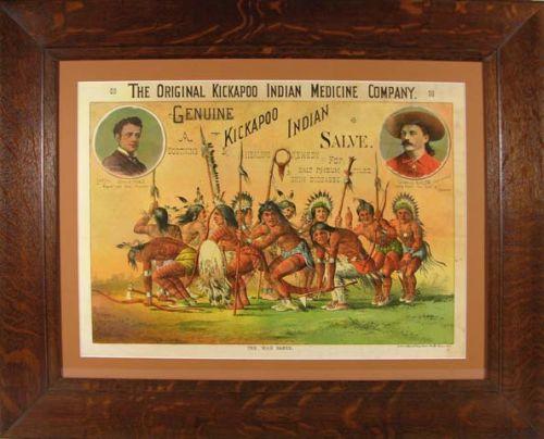 Very early litho for Kickapoo Indian Salve, beautiful period frame, 25" x 18" image size, great graphics & color.