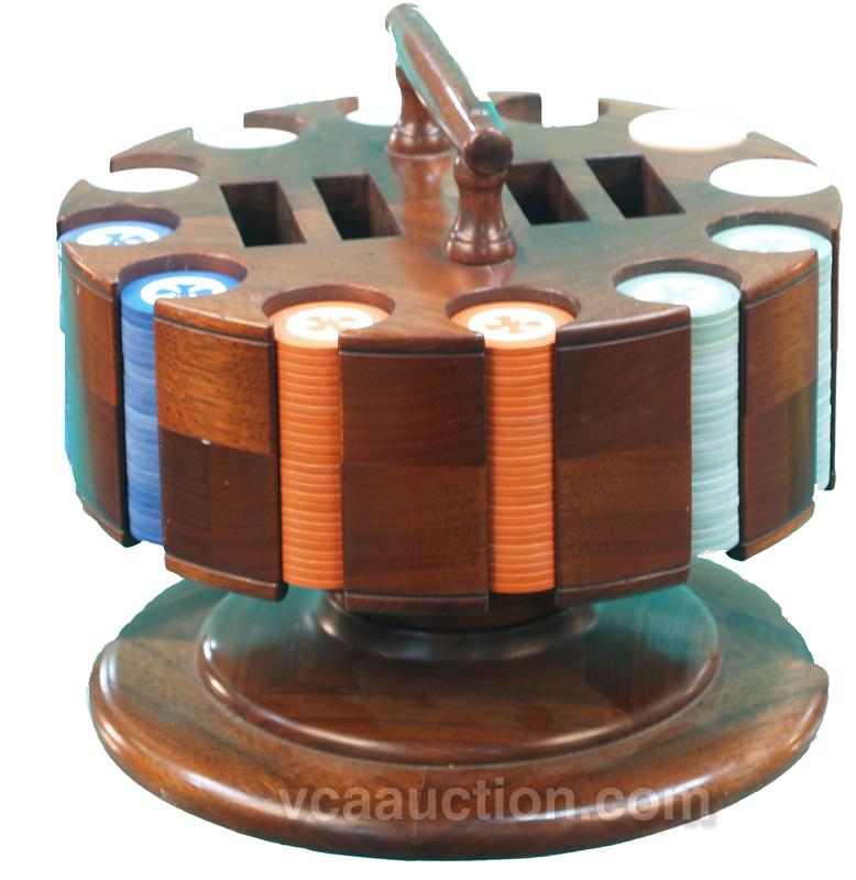 Litho Inlaid Chips and Caddy - Rotating polished wood chip caddy (10”D, 7”H) with 300 clover leaf chips in five colors. Caddy swivels perfectly.