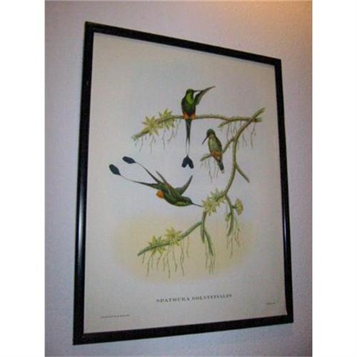 SPATHURA SOLSTITIALIS is the title for this Lithograph. It has name of the artists, J. Gould & W. Hart, del et lith, on the lower left and Walter, Imp. on the right. with tile in the middle. The birds are beautiful with amazing colors framed with black thin wood. This Litho/print is in excellent vintage condition. It is Lovely!