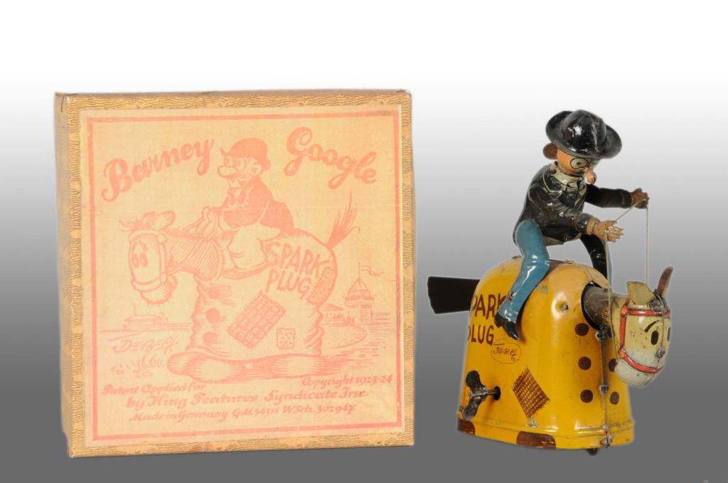 German. Wind-up toy produced by H. Fischer and Company in Nuremberg, Germany. Working. Marked with Nifty trademark , copyrighted “1923 King Feature Syndicate” & Nifty on bottom of toy and marked “Sparkplug” on both sides of base. All original parts. Toy combines handpainting & lithography with Sparkplug’s saddle blanket being the most obvious hand painted feature. Moderate overall wear. Includes excellent reproduction of the original box with the repeated fish trademark of the toy’s manufacturer. Collection of Carl Lobel. Condition (Very Good - Excellent). Size 8" T.