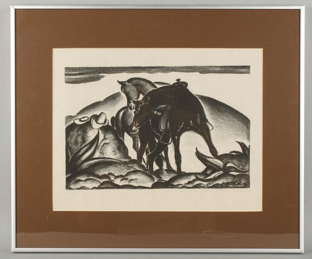Depicting two horses. Matted and framed. Approx. 16-1/2" X 19" Don Megargee is considered "The Dean of Arizona Cowboy Artists". Megargee was commissioned by Arizona's First Governor, George W.P. Hunt to create 15 murals for the Arizona State Capitol building to celebrate Arizona's first active government. His art is now synonymous with the cowboy way of life. “It has almost become the image of Stetson and the West,” says Greg Rosenthal, former president of Stetson, who notes that the original “Last Drop” painting hangs in the company’s New York office.