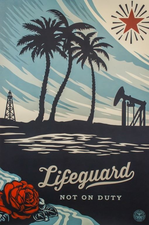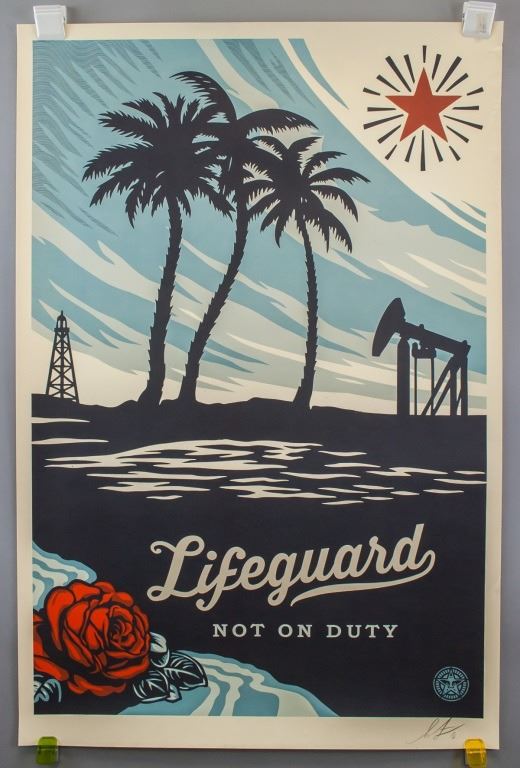 Lithograph on paper. Featuring poster composition reading "Lifeguard not on duty". Signed to the bottom right corner, with "OBEY" insignia to the bottom right. 91 x 60.5 cm (36 x 24 inch).