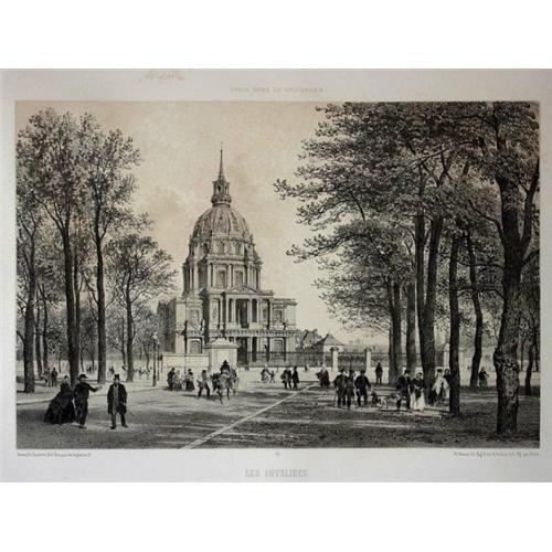 Beautiful lithograph entitled "Les Invalides, Vue prise de la Place Vauban," number 20, one of the series "Paris Dans sa Splendeur." The text on the lithograph reads as follows: "Nantes, lith. Charpentier, Edit. - Paris, quai des Augustins, 55. Ph. Benoist del. Eug. Ciceri & Aubrun lith. Fig. par Bayot." One of a series of six listed separately. In good used condition with toning and foxing consistent with age as shown. Please ask questions, request photos and shipping costs before buying.