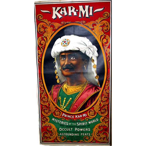 Kar-Mi Lithographic Magic Poster. Kar-Mi (Joseph B. Hallworth 1872-1957) three-sheet linen-backed color lithograph. Prince Kar-Mi presenting Mysteries of the Spirit World and Demonstrations of Occult Powers. Approximately 80" x 40". Bust Portrait of Kar-Mi within a central filigree medallion on red and green background. Copyrighted by Joseph B. Hallworth, 1814. A similar lithograph was sold as part of the Christian Fechner Collection.
