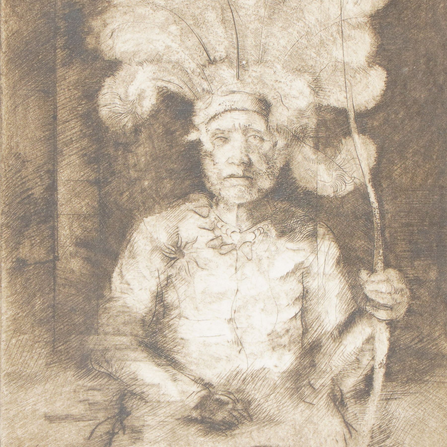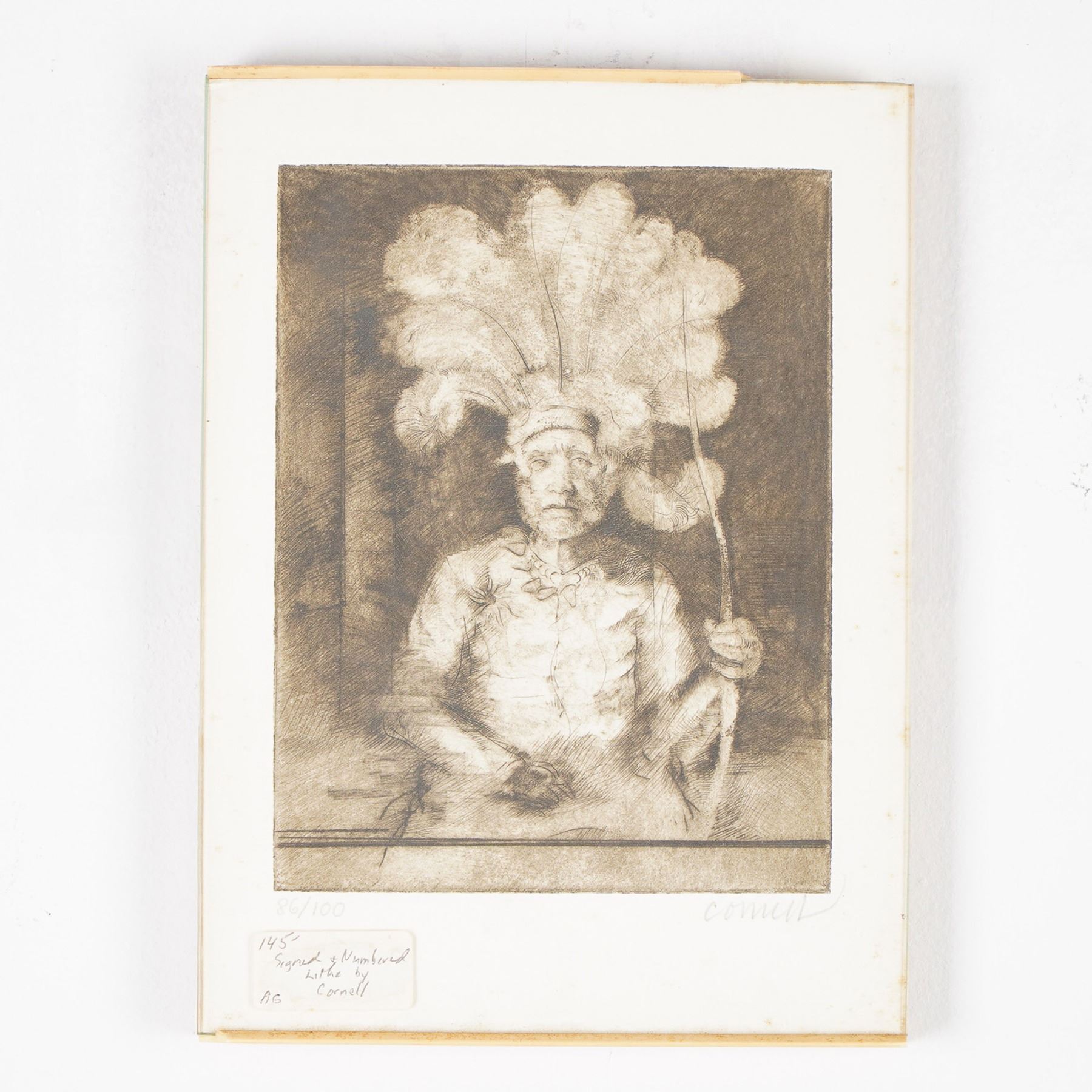Limited edition lithograph by artist Cornell, numbered 86/100 and pencil signed in the lower right. The print features a seated figure wearing an elaborate feathered headdress, rendered in a delicate sepia-toned technique with fine detail and atmospheric shading. The work is mounted on a cream board with a glass cover. The back shows a simple wooden panel.