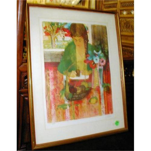 Brilliant colors of red, yellow, green, blue of girl with fuit bowl and flowers. This Paul Collomb, a French artist, lithograph is 60 of 276, and is authenticated by the Societe de la Nouvelle Gravure International on the back with a short biography. The Litho is 22H/16W. Although the frame is in good condition (1" wood with gold), the glass and board in back are loose and will need to be reinforced. Buyer pays shipping and handling costs.