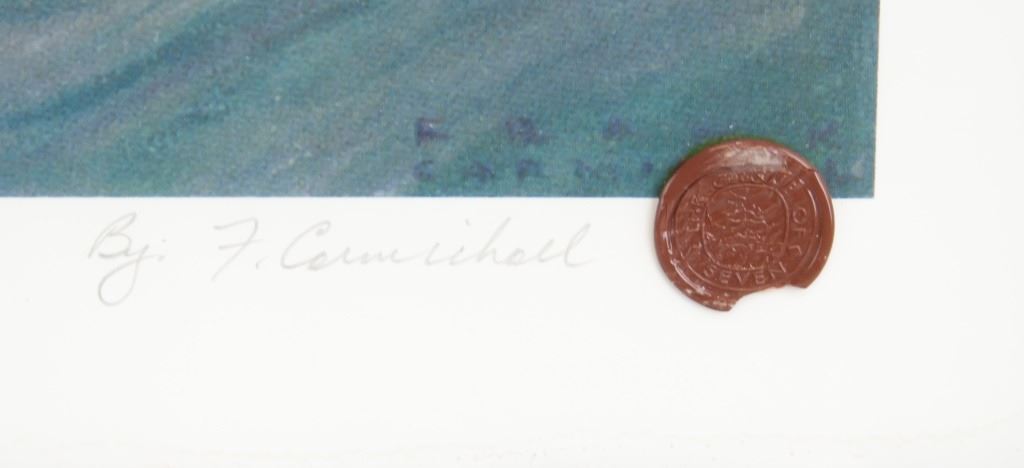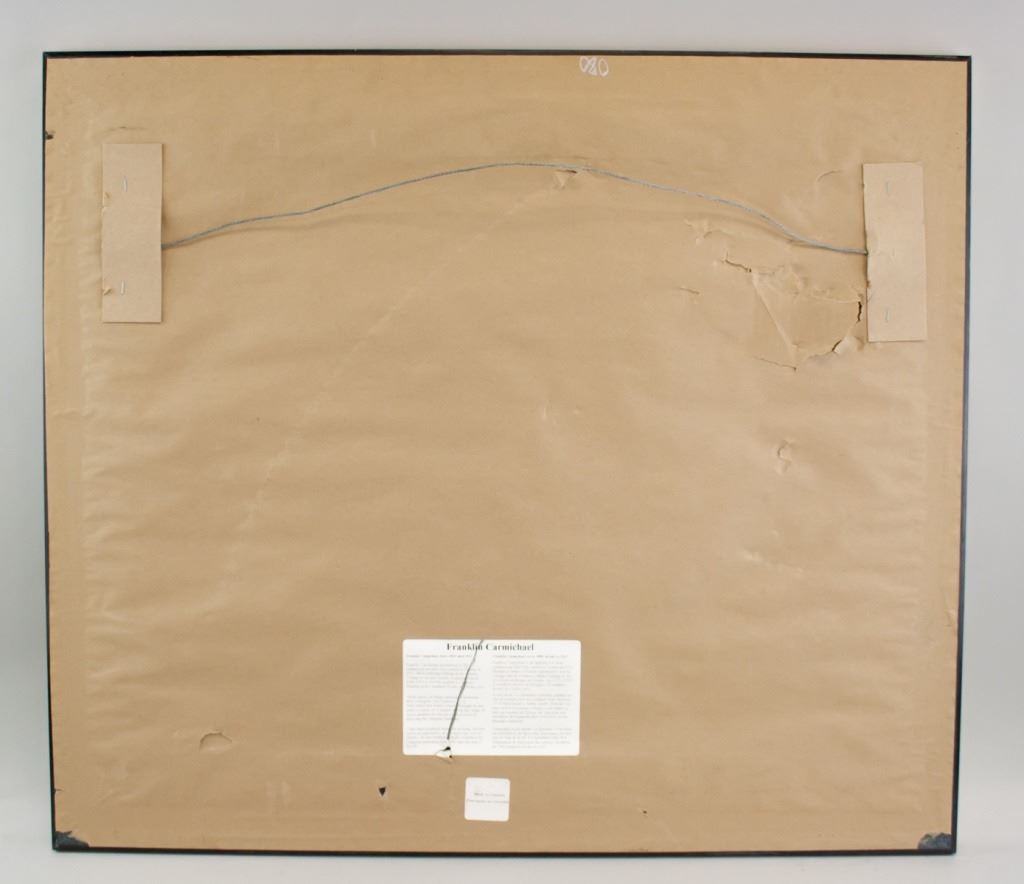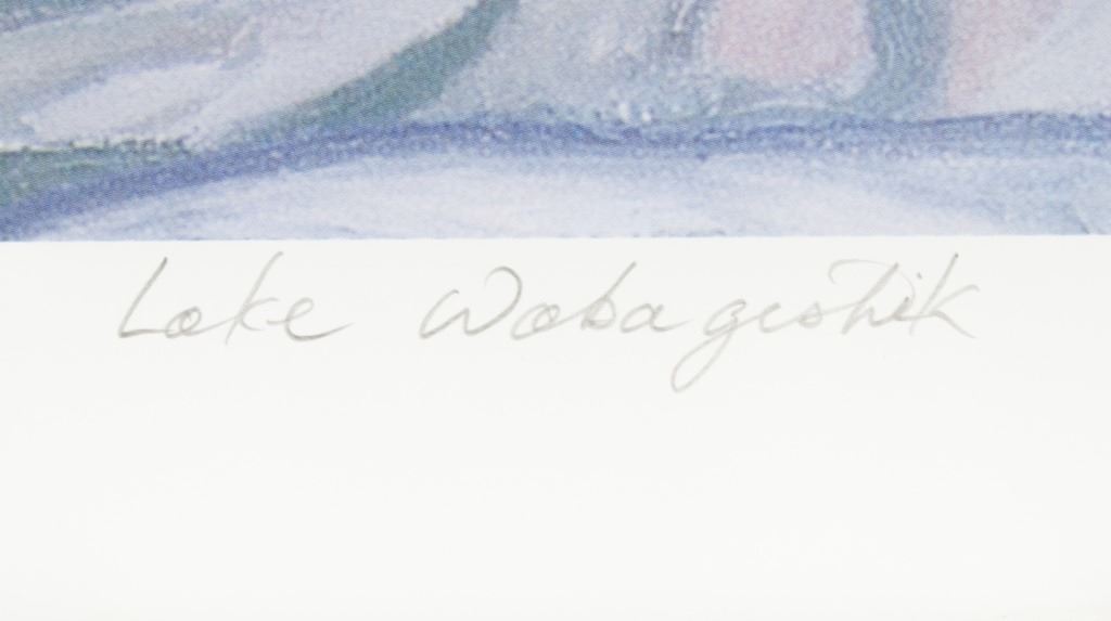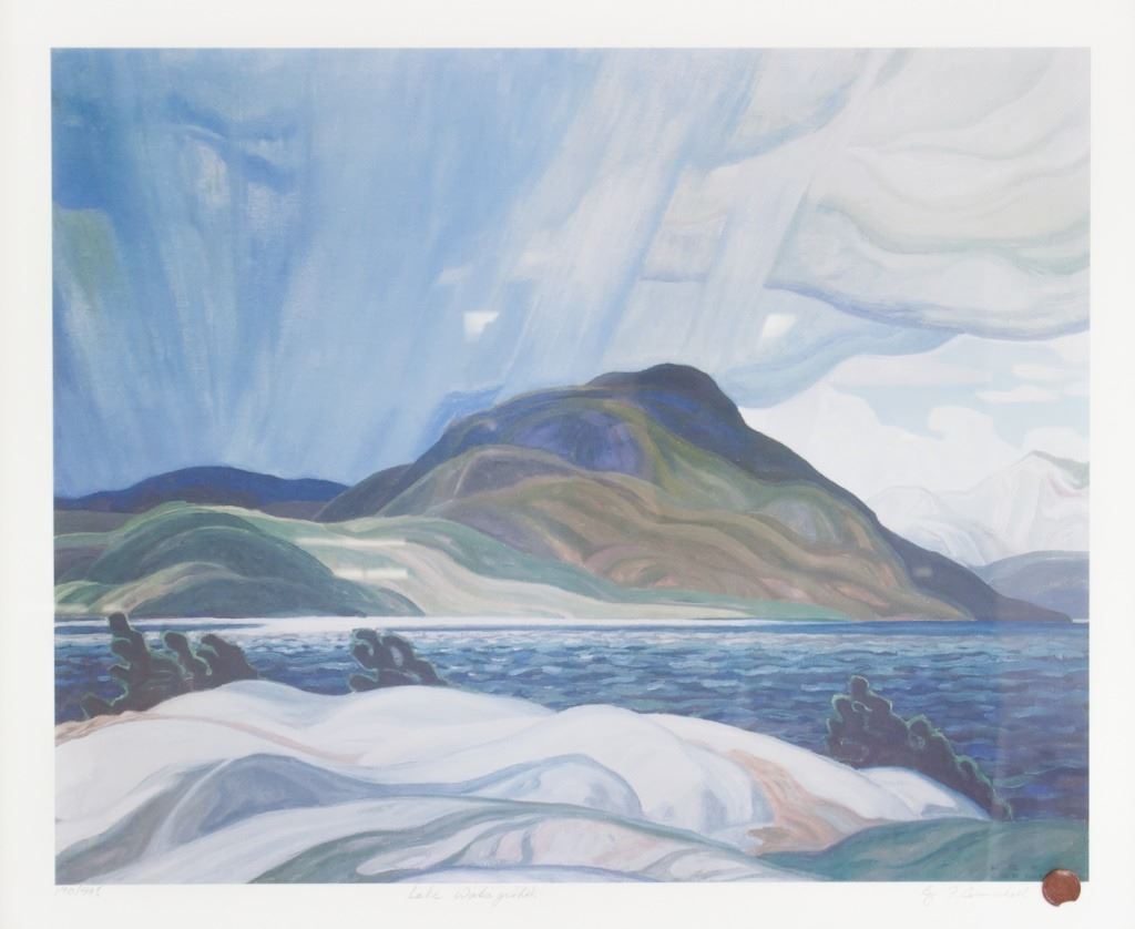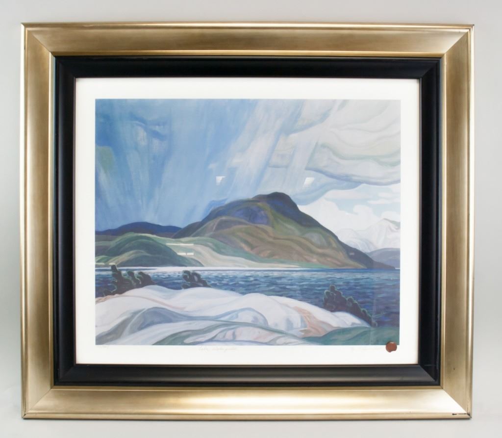 Lithograph on paper, framed. Featuring seascape. "190/995" inscribed to the bottom left. "Lae Wobageshik" inscribed beneath the image. "By F. Carmichael" signed to the bottom right, with red seal. Franklin Carmichael biography on verso. Attributed to Franklin Carmichael (1890-1945, Canadian). Paper size: 43 x 53 cm (17 x 21 inches). Frame size: 70 x 80 cm (27.5 x 31.5 inches).