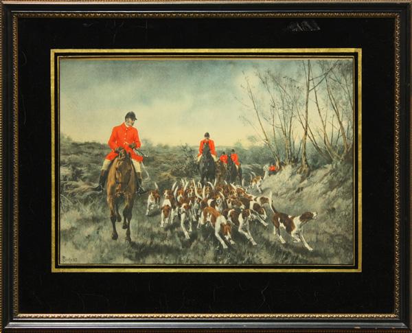 (Lot of 2) Framed color lithographs, Hunting Scenes, after Thomas Blinks (British, 1860-1912) and Heywood Hardy (British, 1843-1933), both signed within the stone, largest overall: 19''h x 23.5''w