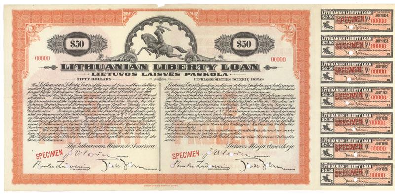 1920, Lithuania. SPECIMEN. $50 Liberty Loan Bond. Vignette of an armored soldier and horse. Lightly punch cancelled. Archival tape repair along weak vertical centerfold. VG. Very Scarce.