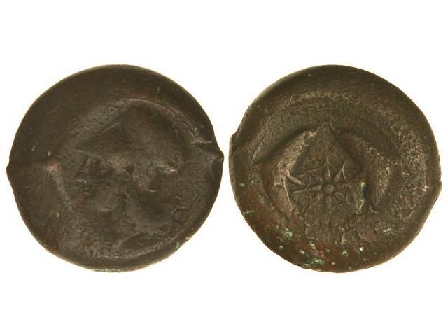 Litra. - 344-336 a.C. - (TIEMPO DE TIMOLEON). - SIRACURA. - Anv.: Cabeza de Atenea con casco corintio a izquierda. Rev.: Estrella, rodeada por dos delfines. 33,60 grs. AE. Pátina marrón. (Golpe de cizalla en reverso. Oxidaciones). Se-1189. BC+. - -