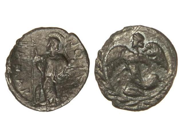 Litra. 460-450 a.C. KAMARINA. Anv.: Atenea en pie a izquierda, alrededor leyenda. Rev.: Nike en vuelo a izquierda, alrededor corona de olivo. 0,70 grs. AR. Pátina oscura. Se-757 var. MBC.