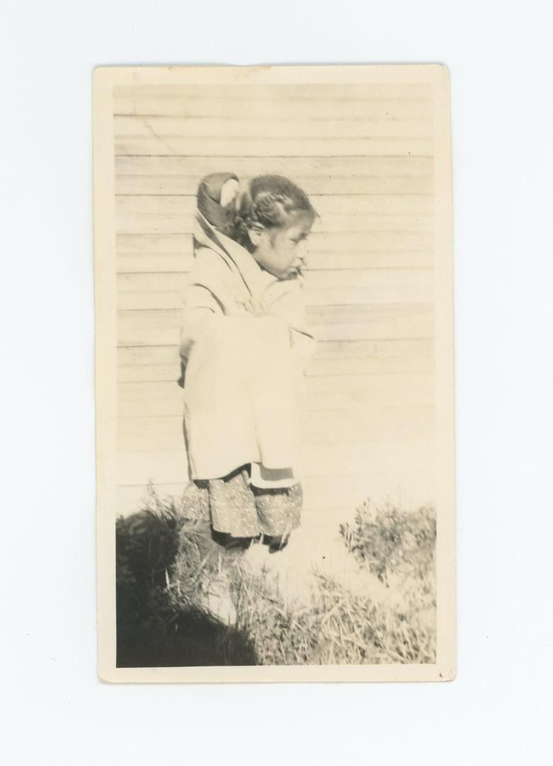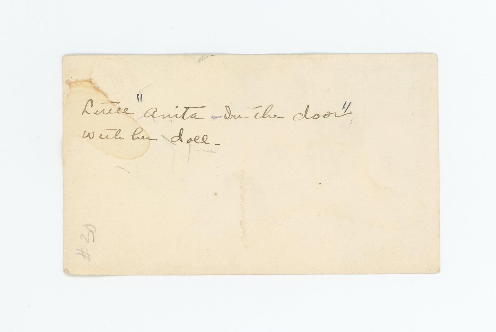 Title on the Back: Little Anita in the Door with her doll. 2 1/2" by 4 1/4" Provenance: Aline Natalie Burgess Claremont Los Angeles, daughter of James Gregor Burgess builder of the Burgess Baptist Church Crow Agency Montana, through Decent.