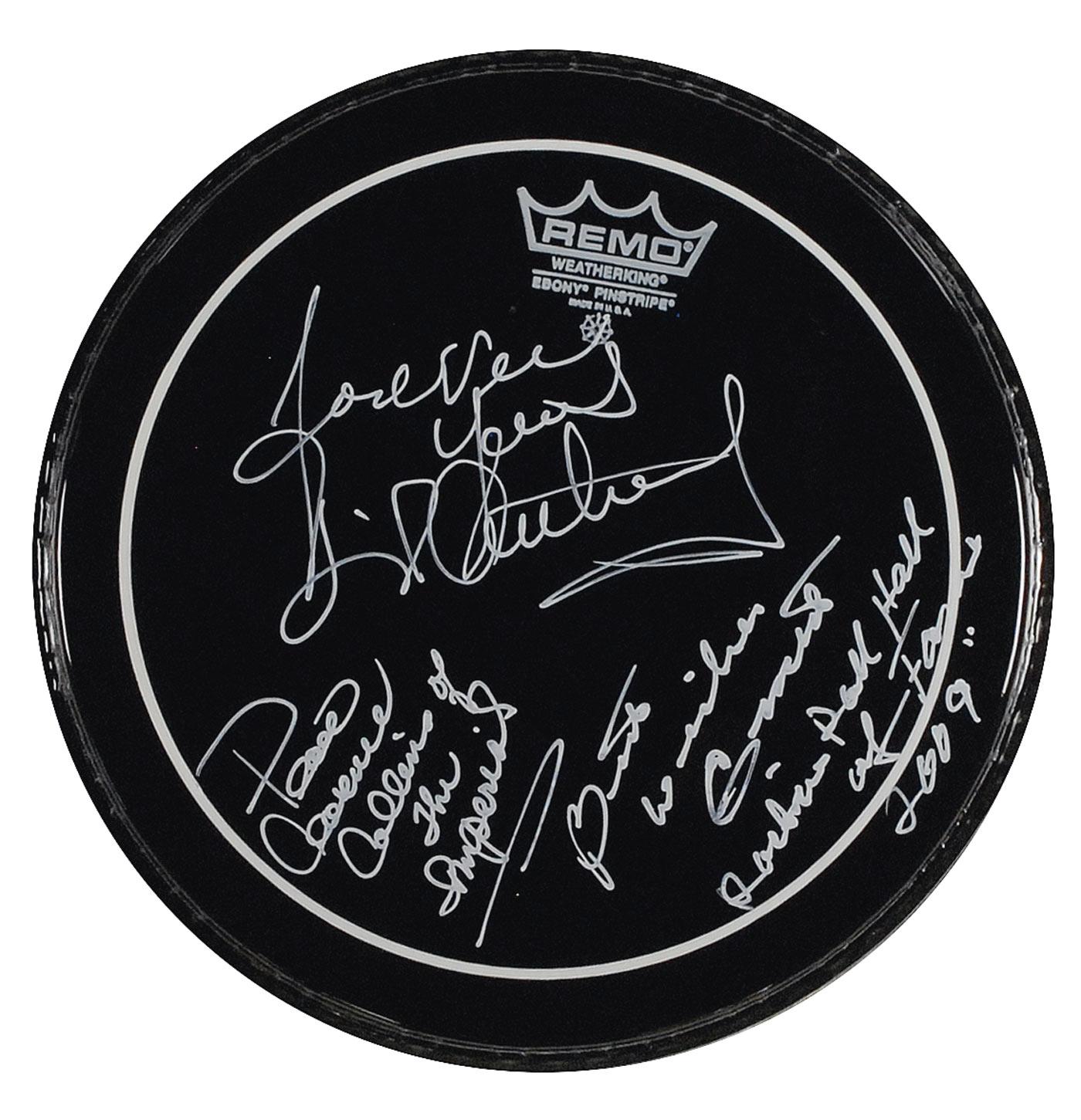 Unused 10” ebony Remo drumhead, signed in white ink by Little Anthony Gourdine, Clarence Collins, and Ernest Wright who adds “Rock & Roll Hall of Fame 2009.” In fine condition.