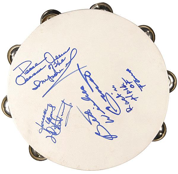 Tambourine, 10” in diameter, signed on the head in blue felt tip by Little Anthony Gourdine, Clarence Collins and Ernest Wright who adds, “Rock & Roll Hall of Fame.” In fine condition.