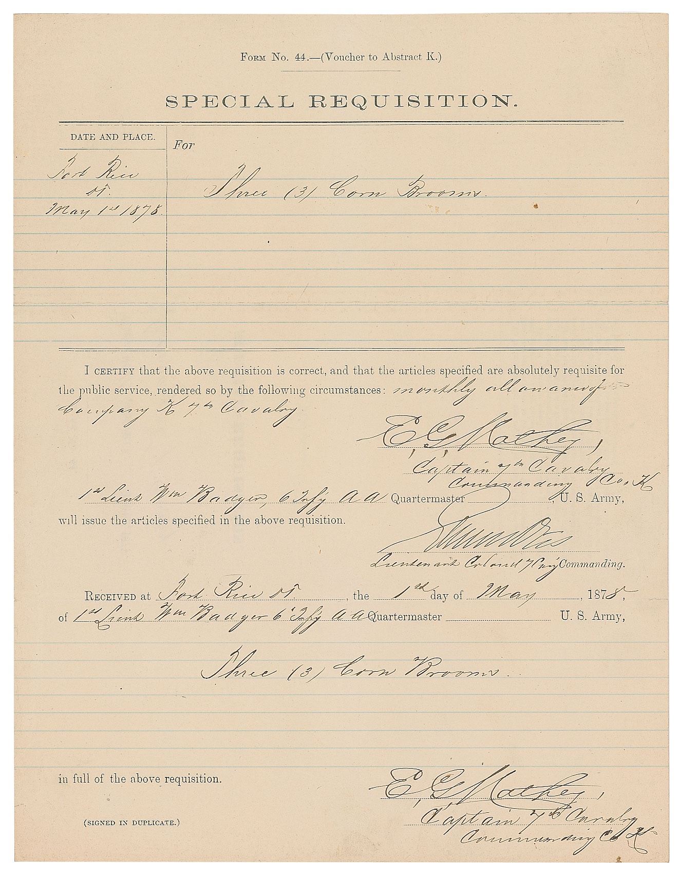 French-born military officer (1837–1915) who fought at Chickamauga, Atlanta, and elsewhere during the Civil War. After becoming 2nd Lieutenant of Company M, 7th Cavalry, in 1867, he commanded the pack train during the Washita Campaign, a function he repeated for Custer at Little Bighorn. A survivor of that infamous battle, he fought against the Nez Perce in the following year. Partly-printed DS, signed “E. G. Mathey,” one page, 8.5 x 11, May 1, 1878. Special requisition document ordering “Three (3) Corn Brooms” to fulfill the “monthly allowance of Company K 7th Cavalry.” Signed twice at the conclusion by Mathey as a captain in the 7th Cavalry and countersigned by Elwell Otis as a lieutenant colonel in the 7th Cavalry. In fine condition. Otis (1838–1909) also participated in the action during the Little Bighorn campaign as a member of the 22nd Infantry Regiment.