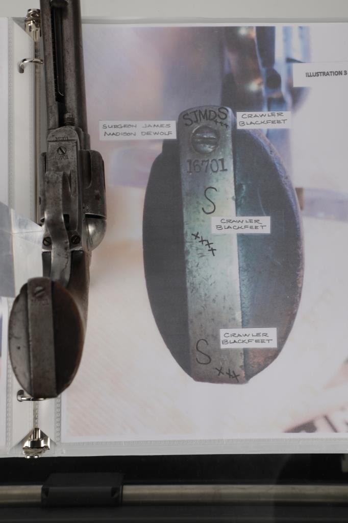 Offered in this lot is the sale highlight and one of the most important and historic pieces, a Battle of the Little Bighorn Surgeon James Madison DeWolf owned Colt Model 1873 Single Action Army U.S. 45 Caliber revolver inspected by A.P. Casey, as well as from Crawler a Blackfeet Chief and accompanied by a Kopec letter. The revolver marked on the side with initials “SJMD (S J M D)” FOR Surgeon James Madison DeWolf. It is also marked in Lakota Togia, Crawler Blackfeet several times (see illustrations). Custer instructed everyone in the U.S. 7th Cavalry to mark their weapons and it is thought the DeWolf added the “S” to denote his contract surgeon status and differentiate from the other men with similar initials. Crawler as born in 1830 to Blackfeet parents and headed the Fool Soldier Society of the Blackfeet and joined the Silent Eaters as the Blackfeet representative. Crawler married Pretty White Woman in 1854 having several children. He was close friends to Sitting Bull and always camped in Sitting Bull’s Hunkpapa circle. Crawler’s Blackfeet band fought in many of the Indian Wars including the Battle of the Little Bighorn, Greasy Grass. He followed Sitting Bull into Canada and surrendered with him in September 10, 1881 at Fort Buford and was transferred to Standing Rock Reservation where he and his band settled eight miles north of Bullhead, South Dakota. Crawler died in 1911 and was buried in Old Kenel, South Dakota. Many of his direct descendants remained near Bullhead and were employed by Wendell Grangaard when his company built the Bullhead Dam in the 1980’s. His descendants state that at the Battle of the Little Bighorn Crawler saw a man in a blue civilian coat who he killed and took this revolver out of his long over coat. Also included in the lot is the journal entries of Dr. James Madison DeWolf. DeWolf was born in 1843 and served in the Union Army in the 1st Pennsylvania Artillery, becoming Corporeal before he was severally wounded and discharged in October 1862. After re-enlisting in September 1864 in Battery A, 1st Pennsylvania Artillery where he served until discharge in June 14 1865, the war ended and DeWolf re-enlisted in the 14th US Infantry of the Army and served as a hospital steward for two years. In May 1872 DeWolf was admitted into Harvard Medical School through an agreement with the Army and in May 1875 he received the certificate of passing the required examination by Calvin Ellis, the Dean of Harvard Medical School with his degree to be received in June. He was denied due to his age for commission into the Army, but later he obtained a contract as an assistant surgeon with the Army on October 16, 1875. He was assigned to serve the Department of the Dakotas and sent to Fort Totten in Dakota Territories. On March 2, 1876, Dr. DeWolf received Special Order No. 27 from General Alfred H. Terry, which ordered him to accompany Companies E an L of the 7th Cavalry from Fort Totten to Fort Abraham Lincoln and report to General George Armstrong Custer. Written out in the historical examination of the revolver is sections from Assistant Surgeon James DeWolf, using his diary and letters to his wife Fannie. The diary stats on the day he left Fort Totten and details the events of his final journey. Noted dates and entries as follows: April 22, 1876I got some blue clothe from the Q. M.D. Today I am getting a pair of blue shirts made so I will have them to wear under a coat…; April 25 got my two new blue shirts today..; June 21 …I think it is very clear that we shall not see an Indian this summer. I went out with Dr. Porter, Lt. Harrington and Hodgson pistol shooting and came out second best to Porter, Cavalry cannot shoot very well; June 24 Marched west on trail, Found lots of new signs; End of Entries. On the morning of June the 25th, 1876 Custer assigned Dr. DeWolf and Dr. Porter to Reno’s divisions. Reno was to spearhead, and he attacked the south village (Sitting Bull’s Hunkpapa). Dr. Porter, a survivor, testified later that he rendered medical assistance to many men in the timber along with Dr. DeWolf. Crawler at the time was camped on the south-east side of the Hunkpapa camp, which put him in the direct path of Reno’s companies of horse soldiers. A more detailed account from the descendants as well as the journal entries are in the historical examination. Crawler said “I saw a man who was not dress like a soldier. He had a large brimmed hat, long overcoat and wearing bright blue shirt. He was carrying a wooden box. I liked the wooden box and his shirt. I thought the box must be special to the man because his horse was going crazy but he did nothing but hold onto the box. I just had to have that box.” Crawler then killed the man, took his box and when trying to remove his overcoat found the revolver in the pocket and forgot the shirt. Crawler said “I took my knife and opened the box. All I found were some knives, but I did not understand why the box was so important to the man.” Crawler encountered Reno’s division and only two surgeons who would have carried these surgical instrument boxes were in Reno’s command, one survived the fight, Porter and the other was killed by Crawler, Dr. Surgeon DeWolf. It is believed that this revolver was part of the 115 revolvers ordered by Custer from Colt as part of the Order 117 which were shipped to Schuyler, Harley and Graham in New York, New York so that Custer could have them altered to his specifications, enclosed in the examination is a copy of the leter from Colt for serial number 13721, which is one of the revolvers that was nickel plated by Adams Plating Company throught Schuyler, Harley and Graham, as instructed by Custer and later issued to One Horn, one of Custer’s Arikara Scouts. This example is considered by Grangaard as one of the most well documented items from the Battle of the Little Bighorn due to DeWolf journal and letters as well as the Crawler testimony supported by his family. Att