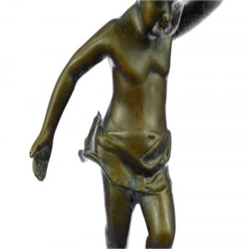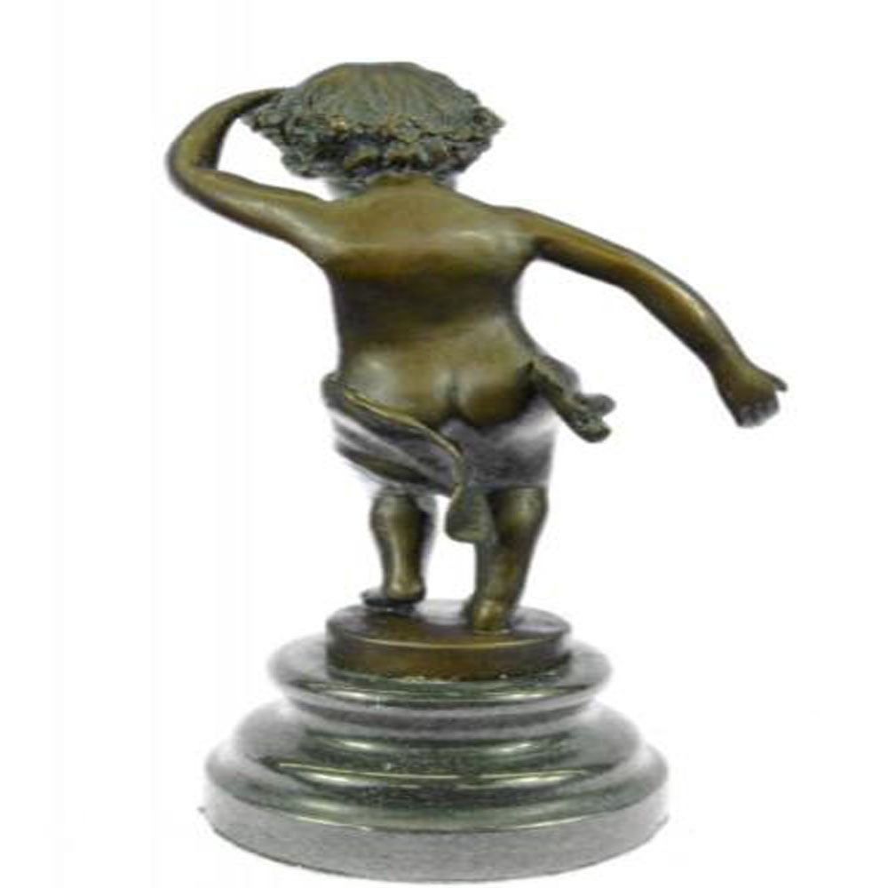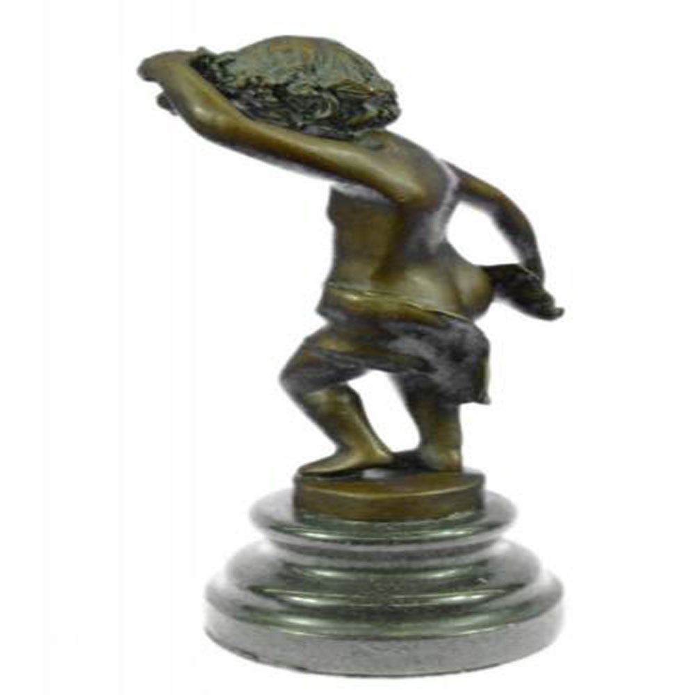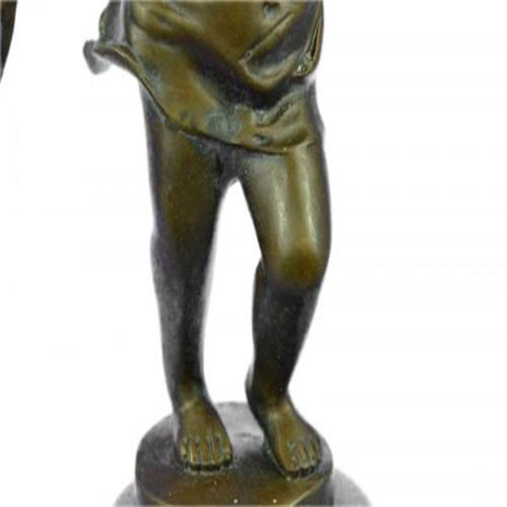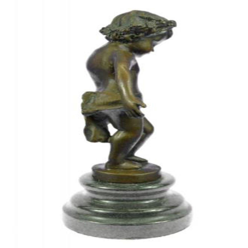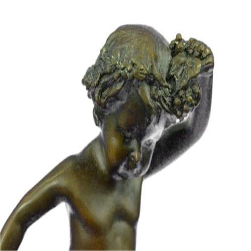 This beautiful Sculpture of an boy as he wonders is spectacular. He places his head slightly down as he ponders, his left hand is placed on his head while he holds a vane of grapes and his right arm is extended out to his side holding a musical instrument. He is absolutely amazing from head to toe, he stand almost nude with just a piece of cloth covering his lower region. The young boy thinks of which tune he will play next, without even realizing that he is actually giving us an adorable pose. He is cast using the ancient old Lost Wax Method stained in brown patina finish for preservation and mounted atop a marble base. Bronze Dimensions with Marble Base: Height 9 X Width 5 inches. Weight: 5 LBS.