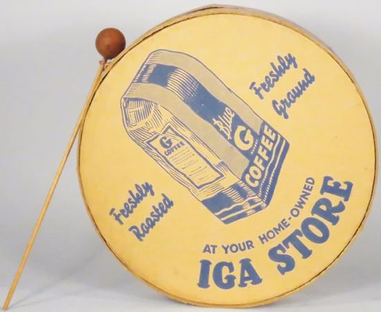 Little Chief Advertising Tom Tom for Blue G Coffee and IGA Stores. NOS. 8 3/4 inch diameter.