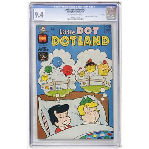 <B>Little Dot Dotland #37 File Copy (Harvey, 1969) CGC NM 9.4 Off-white to white pages.</B></I> Little Lotta cover appearance. Overstreet 2007 NM- 9.2 value = $24. CGC census 12/07: 2 in 9.4, none higher.<BR><BR><b>Shipping:</b> Comics - Slabbed (certified) (<a target="_blank" href="http://www.heritageauctions.com/common/shipping.php">view shipping information</a>)