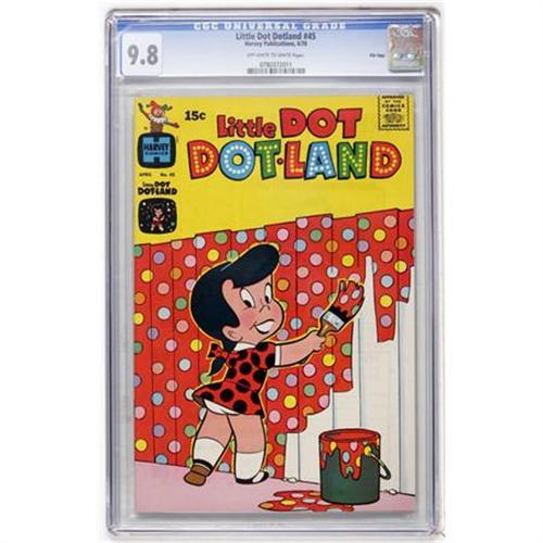 <B>Little Dot Dotland #45 File Copy (Harvey, 1970) CGC NM/MT 9.8 Off-white to white pages.</B></I> Overstreet 2007 NM- 9.2 value = $24. CGC census 12/07: 2 in 9.8, none higher.<BR><BR><b>Shipping:</b> Comics - Slabbed (certified) (<a target="_blank" href="http://www.heritageauctions.com/common/shipping.php">view shipping information</a>)