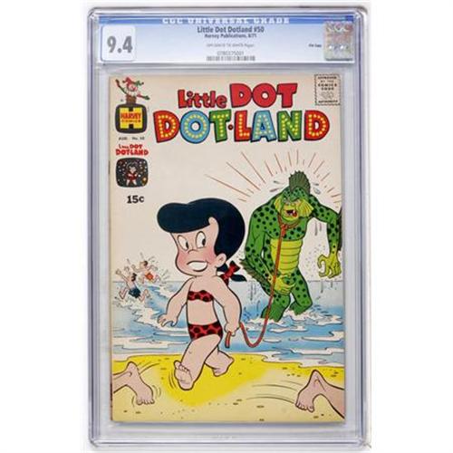<B>Little Dot Dotland #50 File Copy (Harvey, 1971) CGC NM 9.4 Off-white to white pages.</B></I> Overstreet 2007 NM- 9.2 value = $24. CGC census 12/07: 3 in 9.4, 0 higher.<BR><BR><b>Shipping:</b> Comics - Slabbed (certified) (<a target="_blank" href="http://www.heritageauctions.com/common/shipping.php">view shipping information</a>)