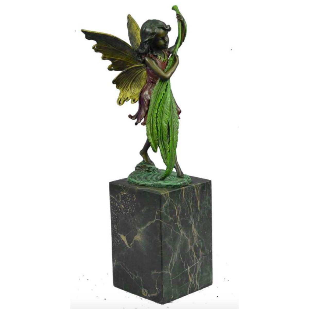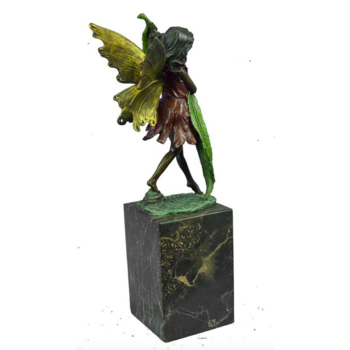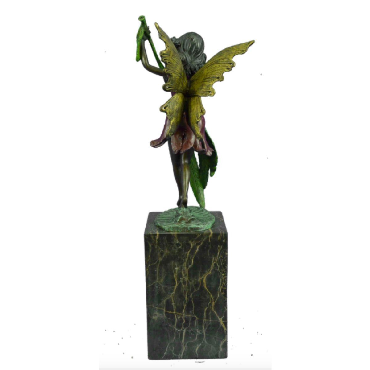 Little girl fairy bookend, sculpture. Lost wax casting method bronze, with colored patina, mounted on marble base. 13" H X 4" W. 8lbs.