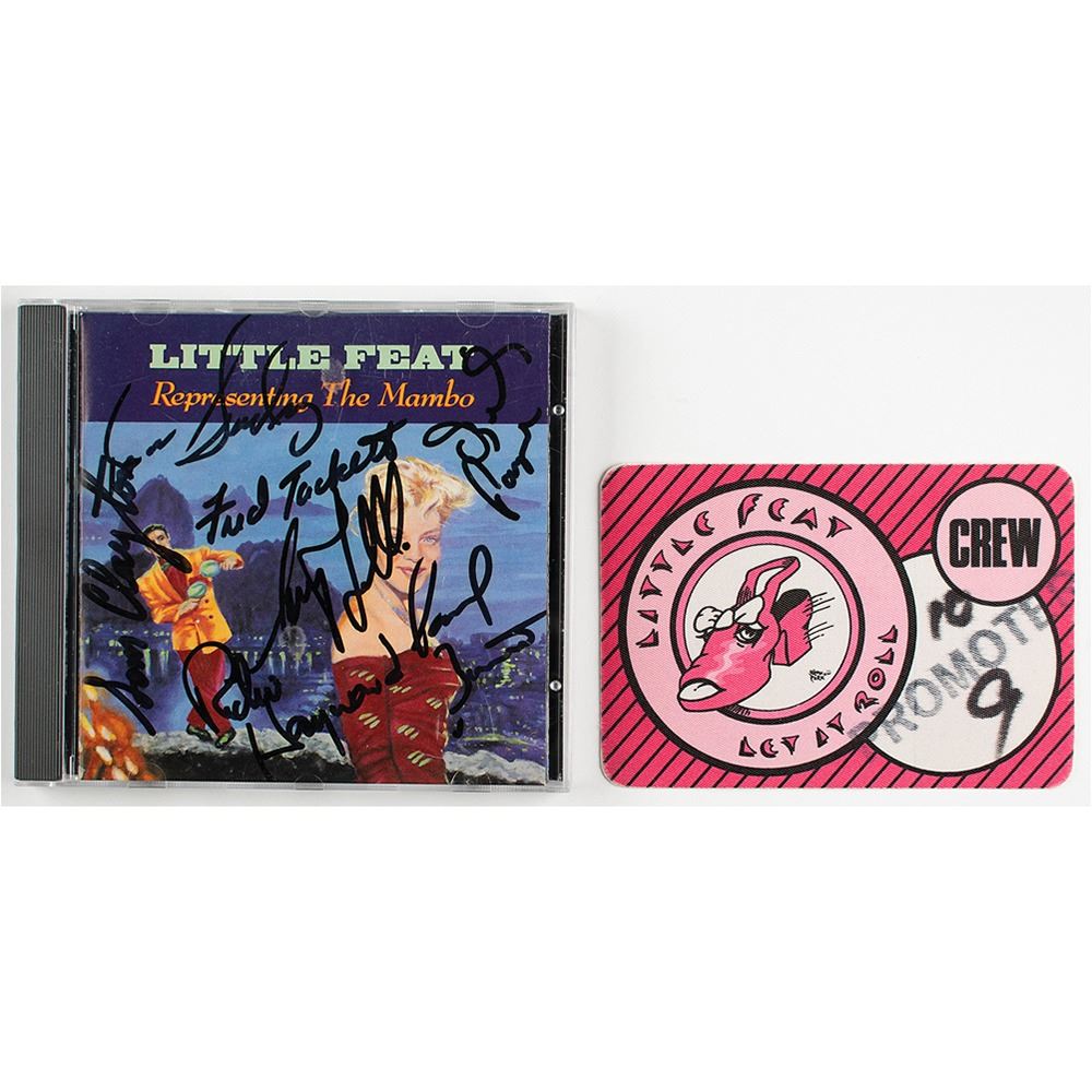 Representing the Mambo CD by Little Feat, signed on the front cover in black felt tip by Paul Barrere, Fred Tackett, Sam Clayton, Richie Hayward, Bill Payne, Craig Fuller, and Kenny Gradney. In fine condition. The CD is included. Accompanied by an unused 'crew' backstage pass for a Little Feat concert.
