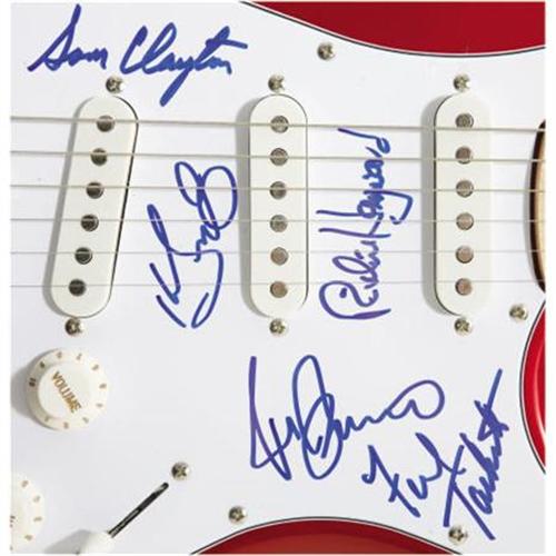<B>Little Feat Signed Guitar.</B></I> A cherry-red Fender Stratocaster electric guitar signed on the pickguard by Little Feat members Sam Clayton, Richie Hayward, Fred Tackett, and two others in blue felt tip on July 21st, 2006 at Rams Head Live Club in Baltimore, MD. In Excellent condition. <I>Accompanied by a COA from PSA/DNA.</B></I><BR><BR><b>Shipping:</b> Musical Instruments, Large (<a target="_blank" href="http://www.heritageauctions.com/common/shipping.php">view shipping information</a>)