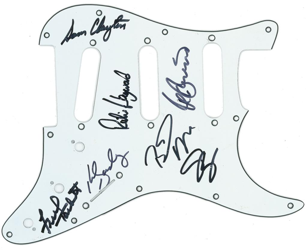 White pickguard for a standard-size stratocaster, signed in black felt tip by Sam Clayton, Fred Tackett, Paul Barrere, Richie Hayward, Bill Payne, Kenny Gradney, and Shaun Murphy. In fine condition.