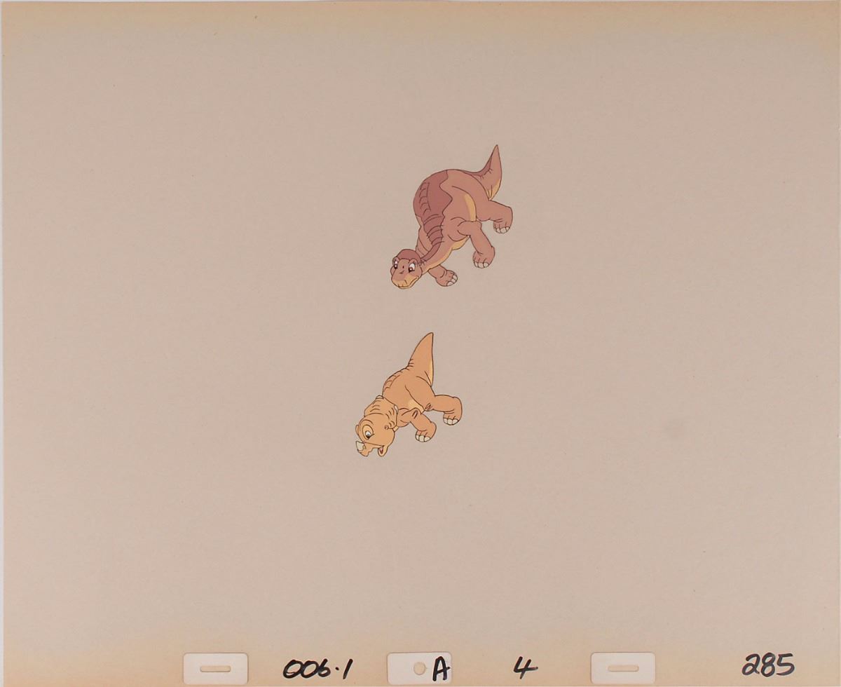 (Don Bluth Studios, 1988) Original production cel featuring Little Foot and Cera from The Land Before Time. Images measure 2.25 x 2.25 and 2.5 x 2.75. In fine condition.