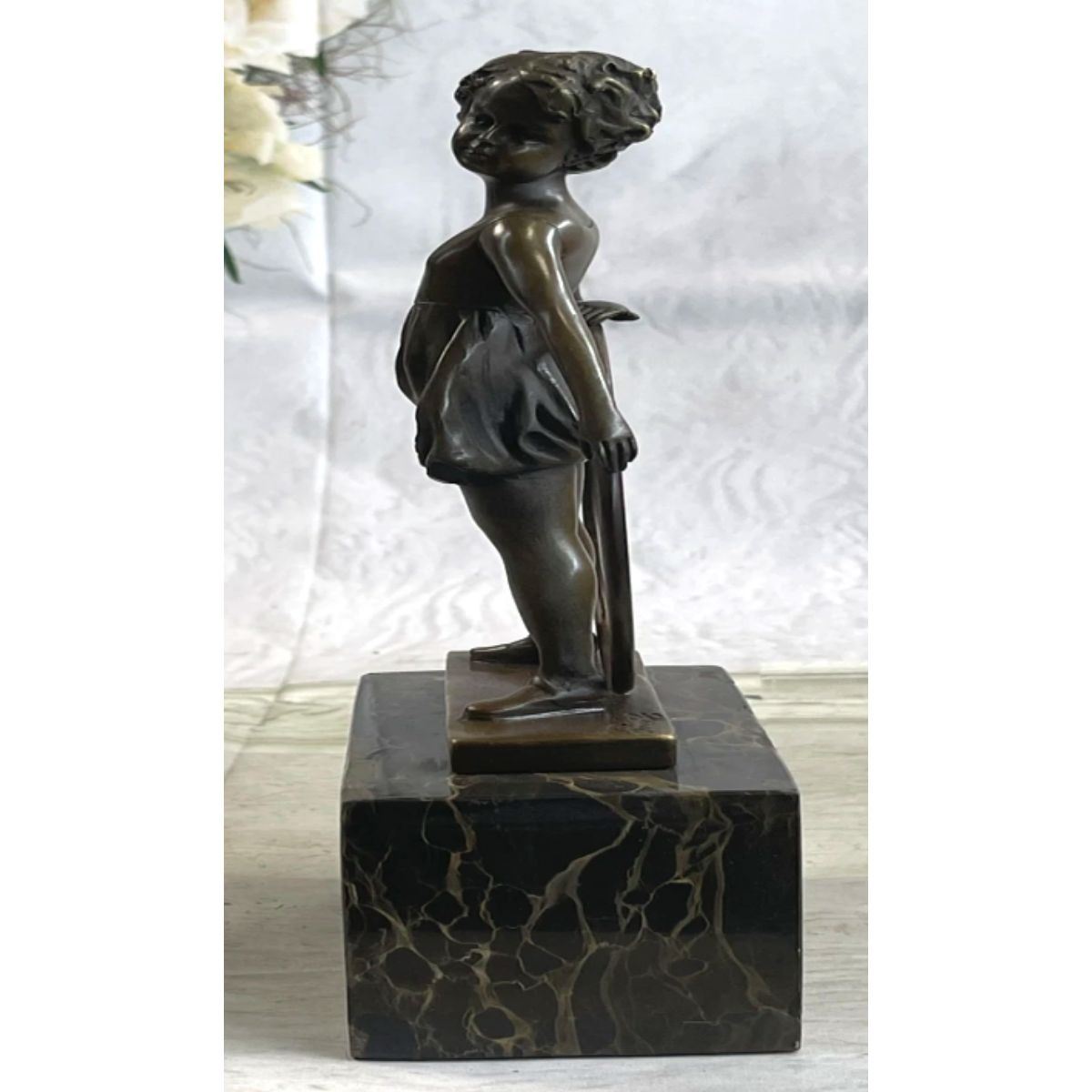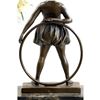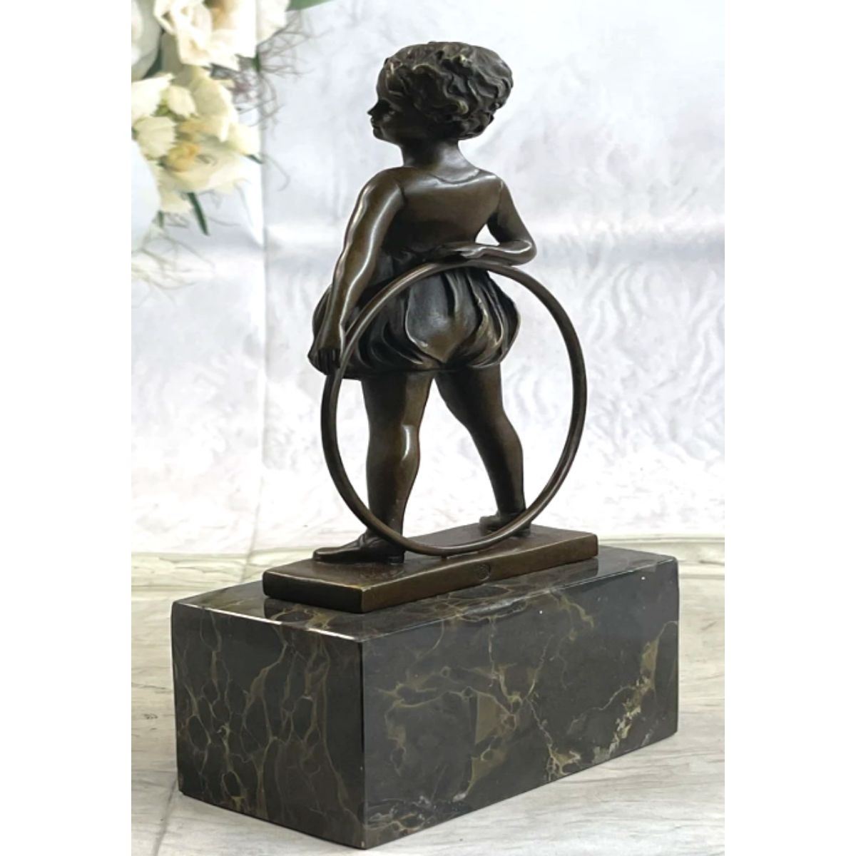 Little Girl Playing With A Hoop sculpture. Lost wax casting method bronze, with brown patina, mounted on a marble base. 10" H X 5" W. 8 lbs.