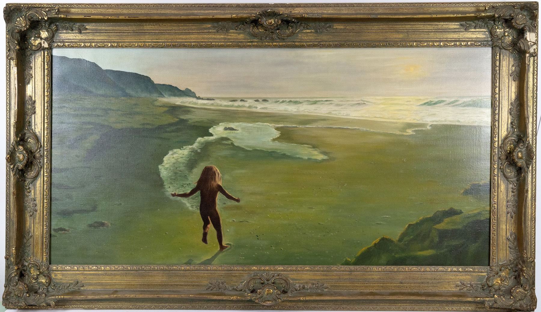 Original oil painting titled "Little Girl on the Beach" by South Lake Tahoe artist Mildred Moore. Back of painting, written on wooden frame, "Best of Show 8/15/68". Moore is not listed in NV artists directory. Oil on canvas, ornate gilt wooden frame, not under glass. Moore's business card attached to back of frame. Dimensions: (frame) 56 1/2" x 32 1/2"; (image) 47" x 23". Signed by Moore in lower right corner of painting. Condition: no tears in canvas, excellent condition; wooden frame chipped in upper right corner, several nicks along frame edges, gold paint worn away throughout much of frame.
