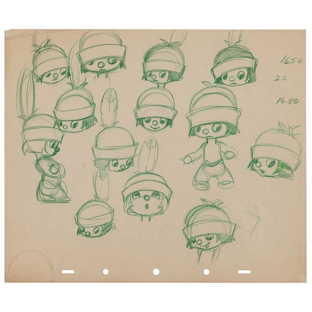 (Walt Disney Studios, 1937) Fantastic original concept preliminary model sheet drawing featuring the title character from Little Hiawatha, showing the diminutive native in thirteen different poses—including full-figure front and profile views, plus eleven examples of his face at several slightly different angles. Accomplished in green colored pencil on untrimmed 12 x 10 animation paper. In fine condition. Inspired by the poem 'The Song of Hiawatha' by Henry Wadsworth Longfellow, this was the last Silly Symphonies short to be released by United Artists.
