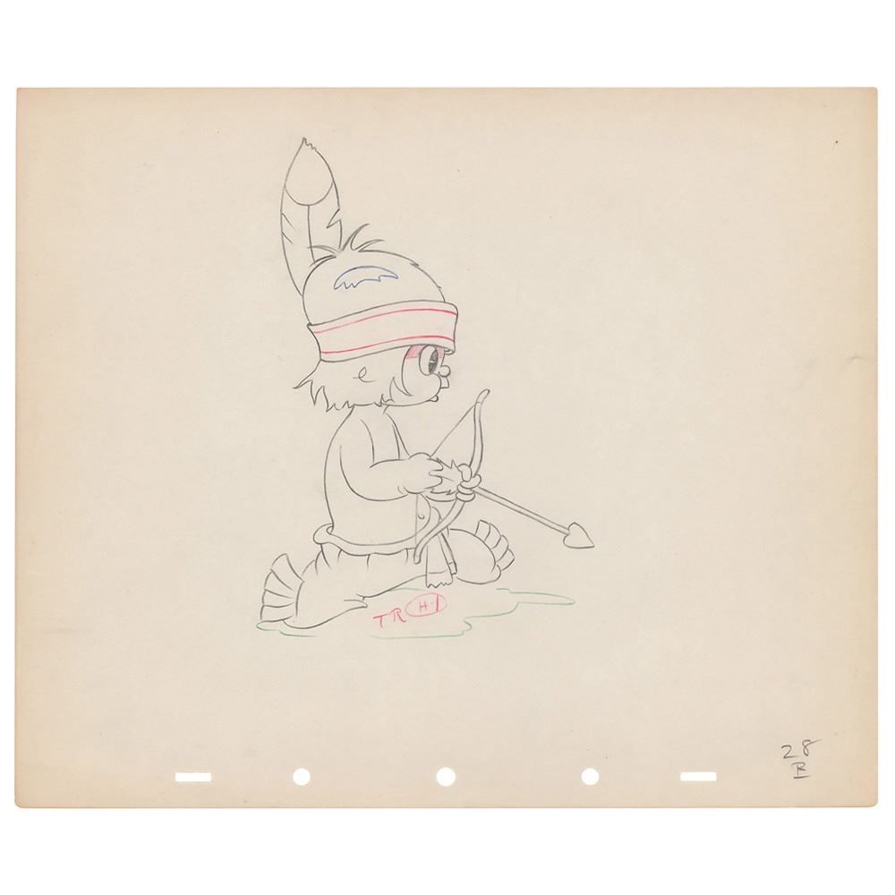 (Walt Disney Studios, 1937) Original production drawing featuring Little Hiawatha from the Silly Symphonies short Little Hiawatha, showing the cute little Native American holding his bow in profile. Accomplished in graphite and colored pencil on untrimmed 12 x 10 animation paper marked "28 R" in the lower right corner. Image measures 4.75 x 7. In fine condition. Accompanied by a certificate of authenticity from Howard Lowery.