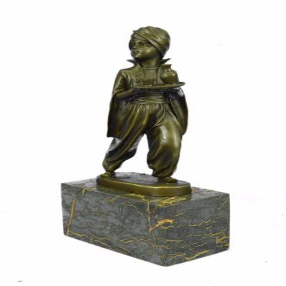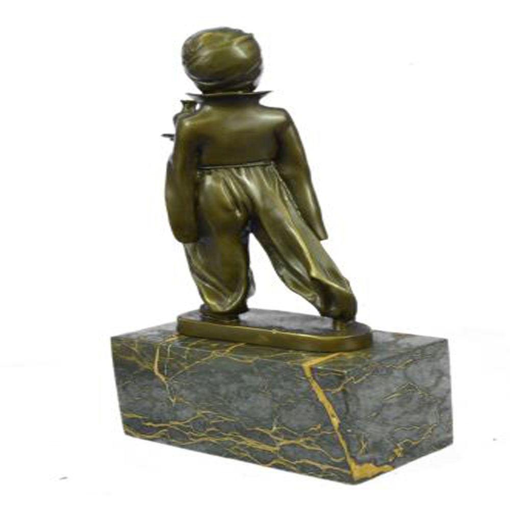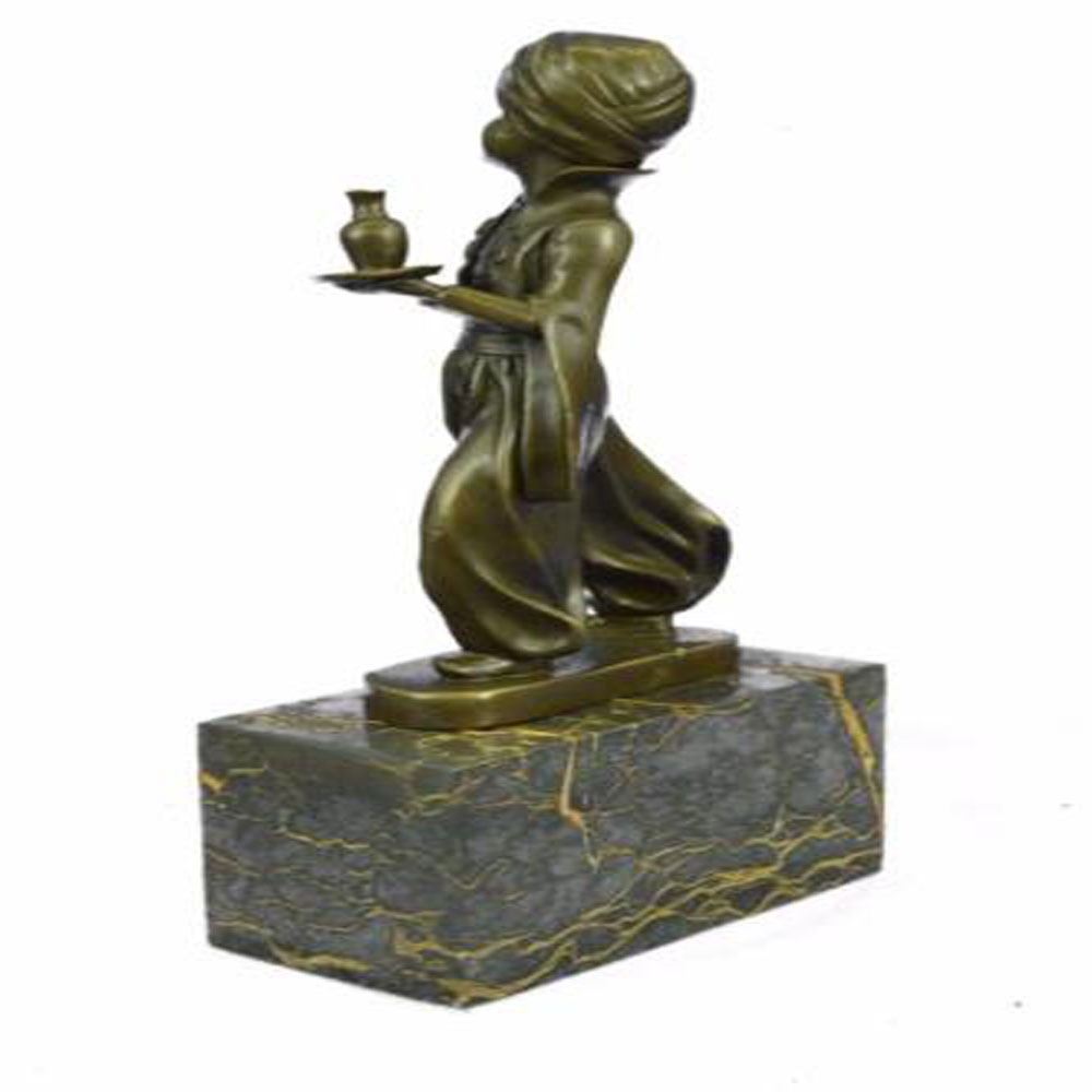 A young Arabian boy is a servant in a grand palace. He carries a small waiter with a round bottle for his master to quench his thirst. His hair is wrapped up in a turban and he wears a loose jumpsuit. He smiles innocently as he passes through a crowd of adults. This brown patina Sculpture was cast using the Lost Wax Method and mounted on a marble base. Dimensions: Height 11 X Width 5 inches. Weight: 8 LBS.