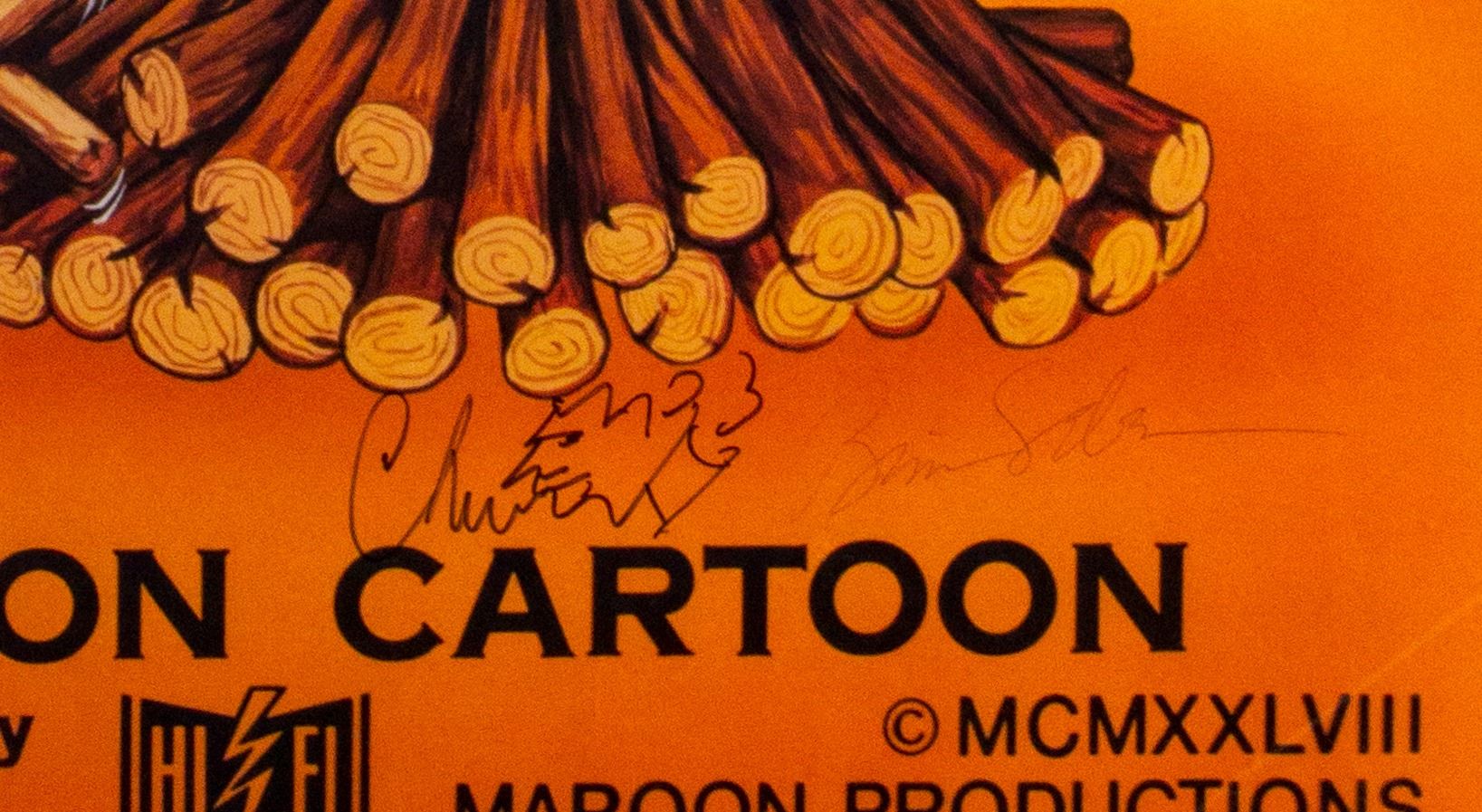 (Disney, 1988) An original one sheet promotional poster created for the feature film "Who Framed Roger Rabbit". The poster is titled "The Little Injun that Could" and depicts Roger and Baby Herman, with production information for R. K. Maroon. This rare poster is signed by the voice of Roger Rabbit, Charles Fleischer and a second unknown individual. Measuring 41"x27", the poster is in fair condition with some creasing throughout the poster and some small tears around the edges, primarily in the lower-left corner, and some general wear throughout from use. The back side is marked as No. 104.