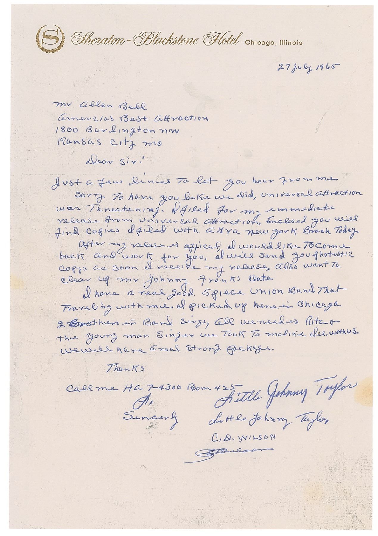 American blues and soul singer (1943–2002) whose biggest hit was 'Part Time Love,' released in 1963. LS signed “Little Johnny Taylor,” one page, 7.25 x 10.5, Sheraton-Blackstone Hotel letterhead, July 27, 1965. Letter to Allen Bell at America's Best Attraction, in part: "Sorry to have you like we did, Universal Attraction was threatening. I filed for my immediate release from Universal Attraction, enclosed you will find copies I filed with AGVA New York branch today. After my release is official, I would like to come back and work for you…I have a real good 5 piece union band that traveling with me." In fine condition, with a few small stains. Accompanied by a later carbon copy of a letter sent to Taylor by Bell, along with a letter written on Taylor's behalf.